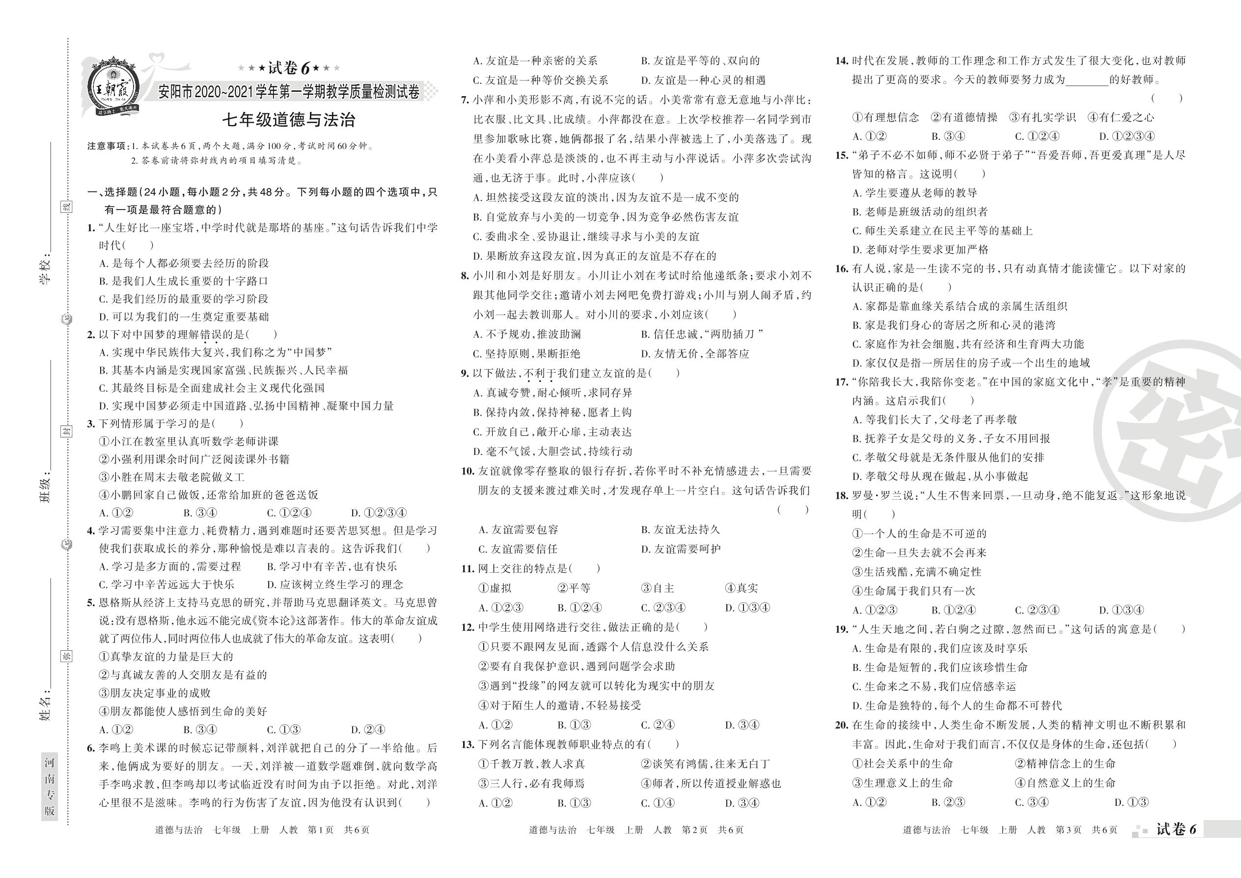 安阳市2020~2021学年第一学期教学质量检测试卷七年级道德与法治(人教版)【6】