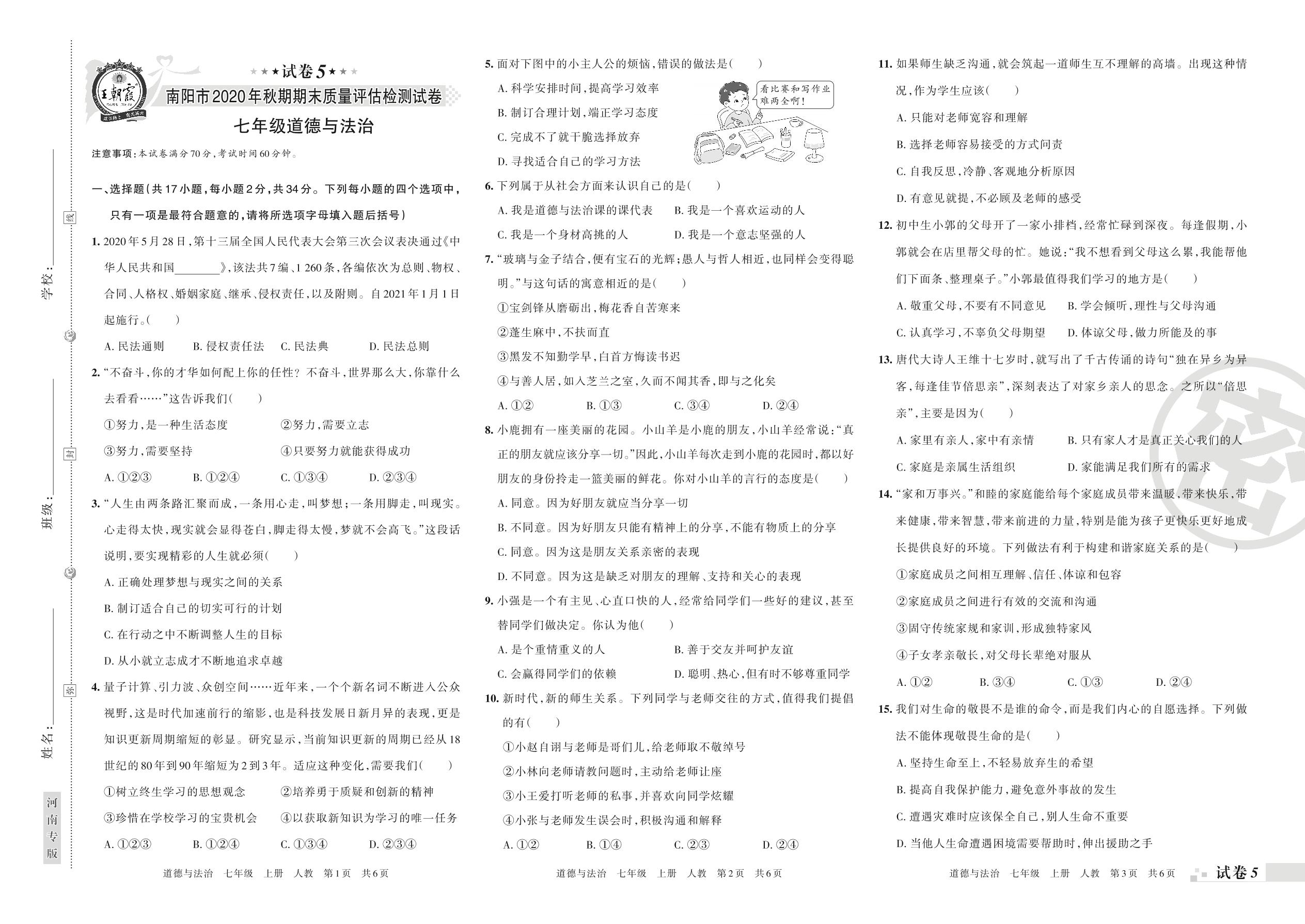 南阳市2020年秋期期末质量评估检测试卷七年级道德与法治(人教版)【5】