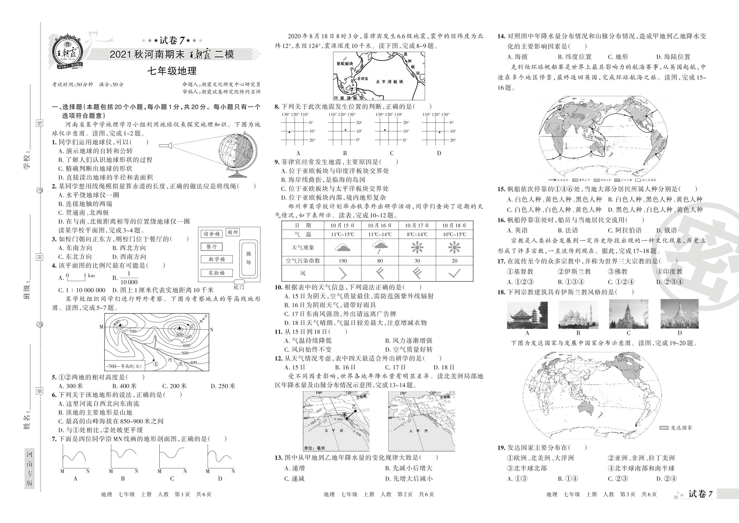 王朝霞期末模拟卷七年级上册地理(人教版)【7】