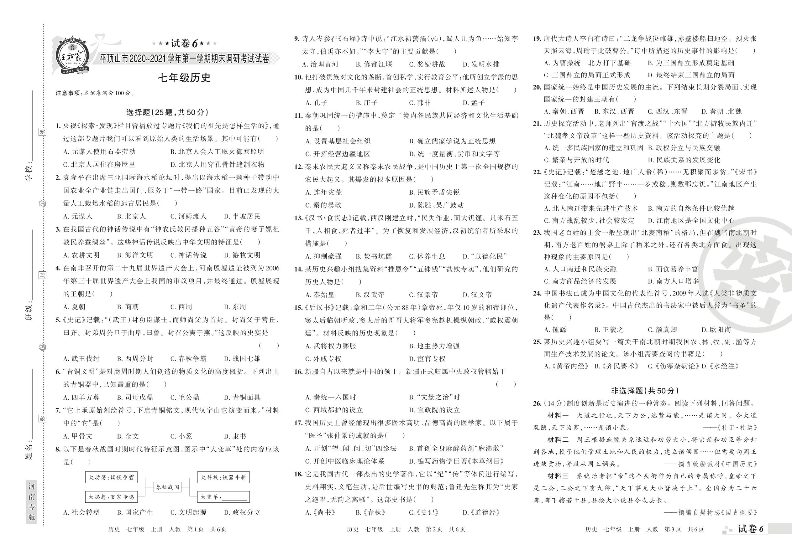 平顶山市2020~2021学年第一学期期末调研考试试卷七年级历史(人教版)【6】