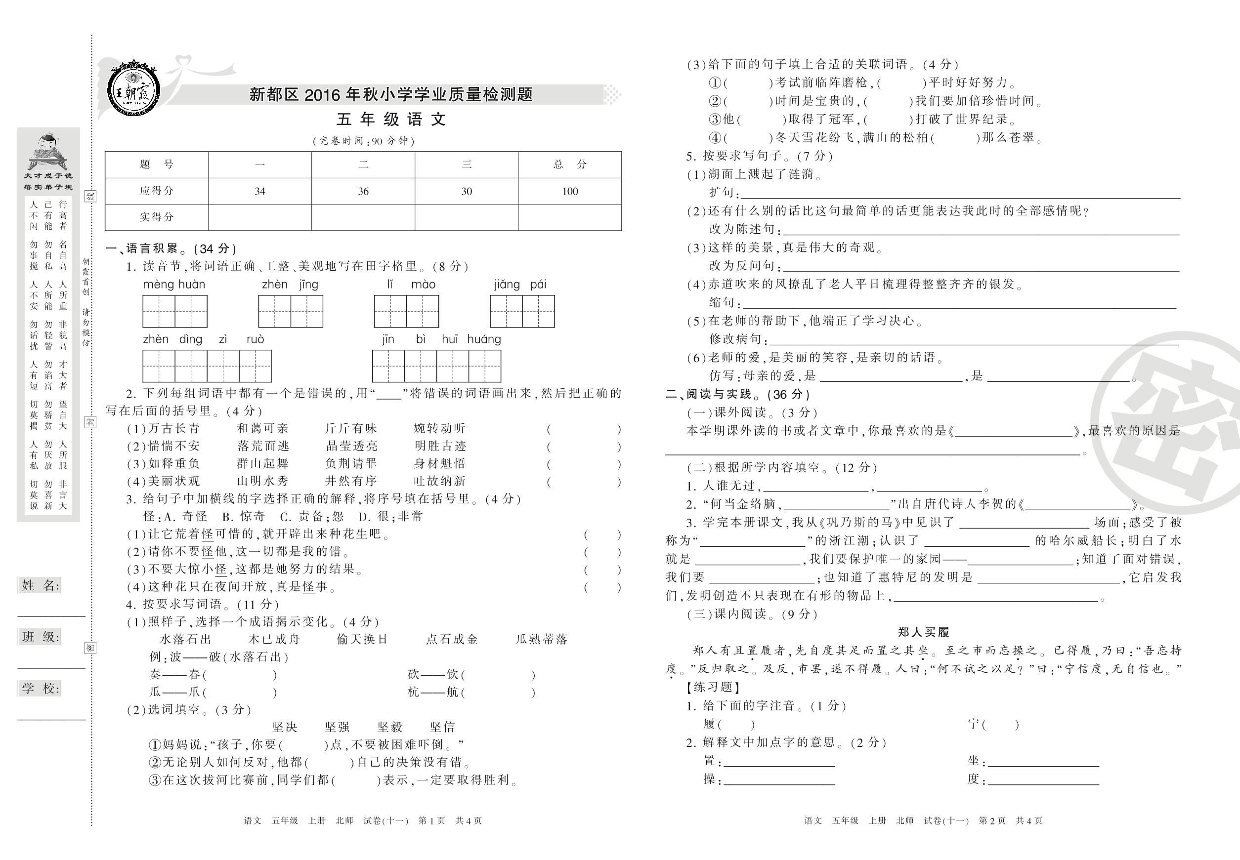 2016-2017学年第一学期成都市新都区五年级语文试卷(北师版)【11】