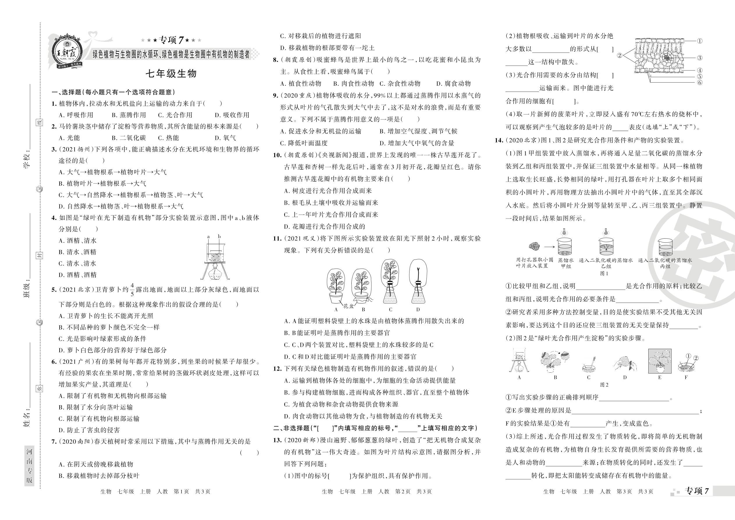 王朝霞期末专项卷——绿色植物与生物圈的水循环、绿色植物是生物圈中有机物的制造者七年级上册生物(人教版)【7】