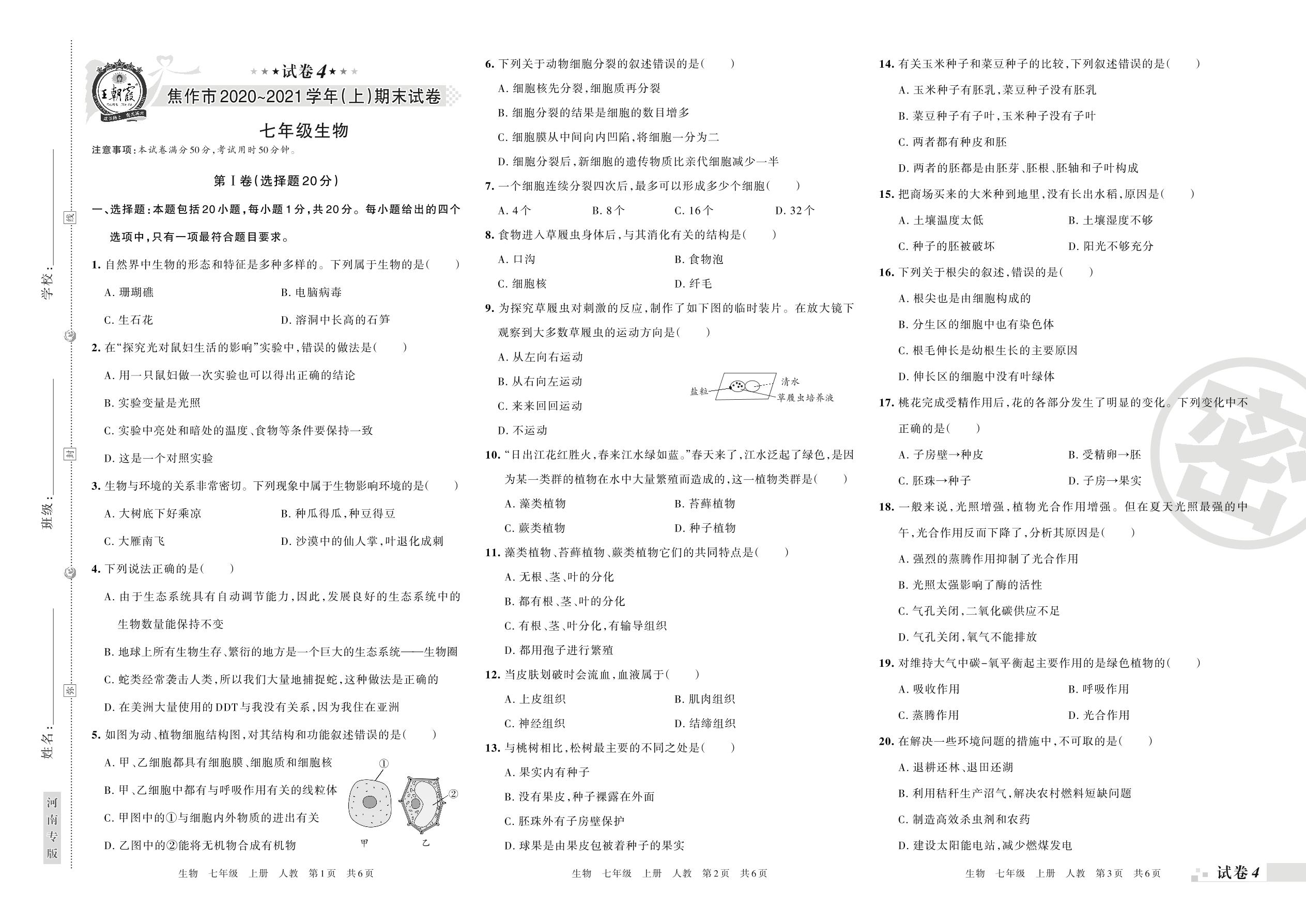 焦作市2020~2021学年(上)期末试卷七年级生物(人教版)【4】