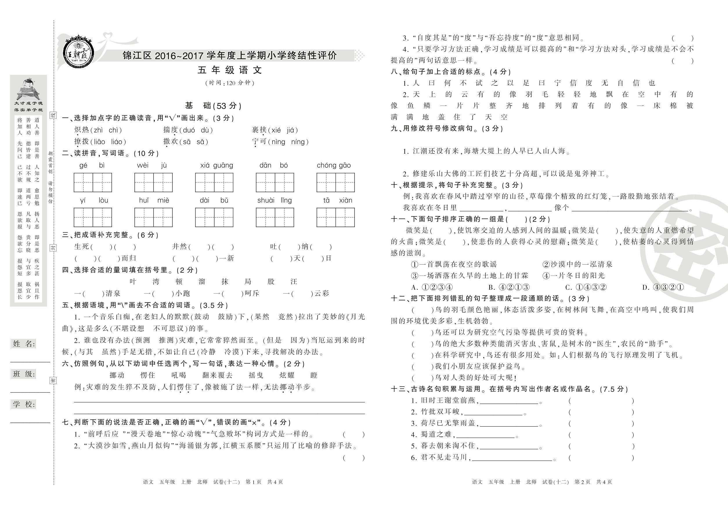 2016-2017学年第一学期成都市锦江区五年级语文试卷(北师版)【12】