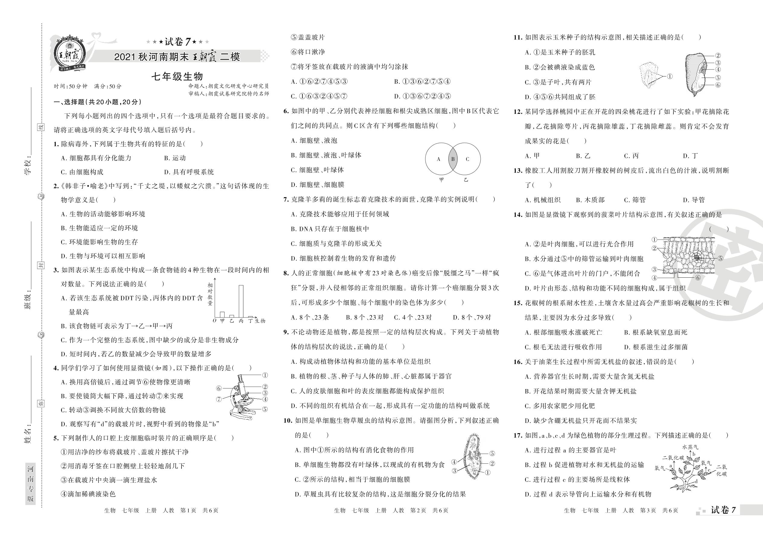 王朝霞期末模拟卷七年级上册生物(人教版)【7】