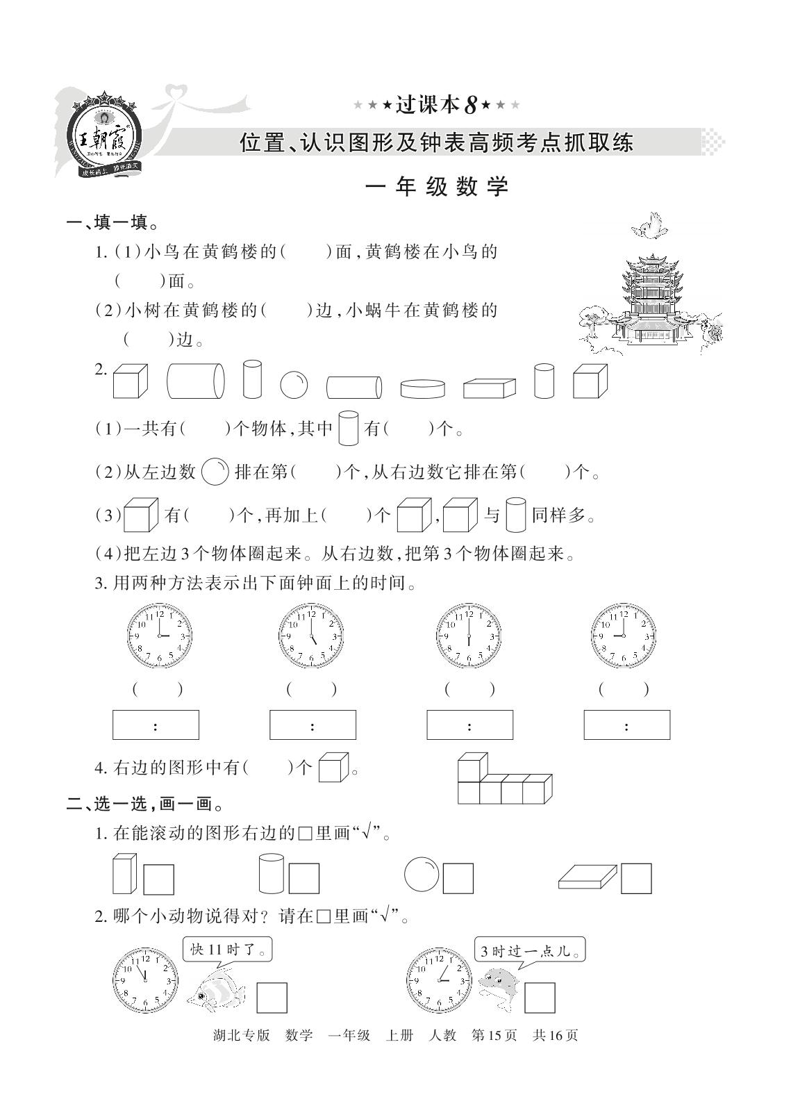王朝霞期末过课本——位置、认识图形及钟表高频考点抓取练一年级上册数学人教版【8】