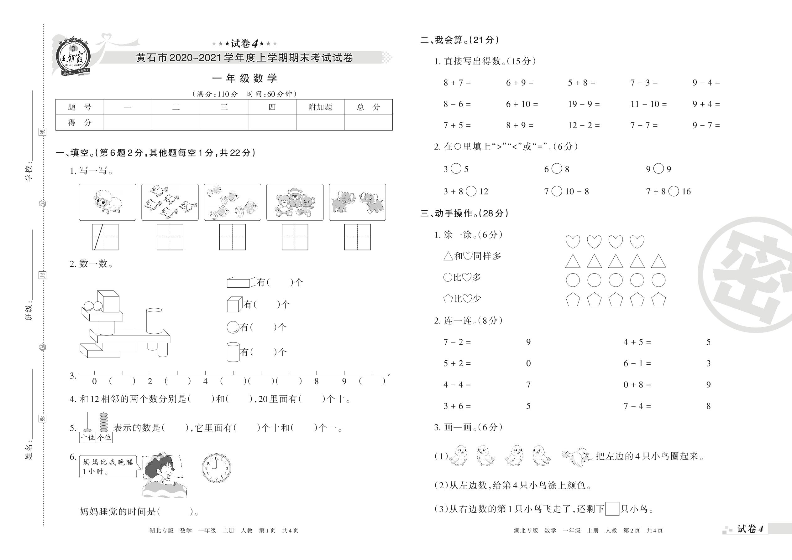 黄石市2020~2021学年度上学期期末考试试卷一年级数学人教版【4】
