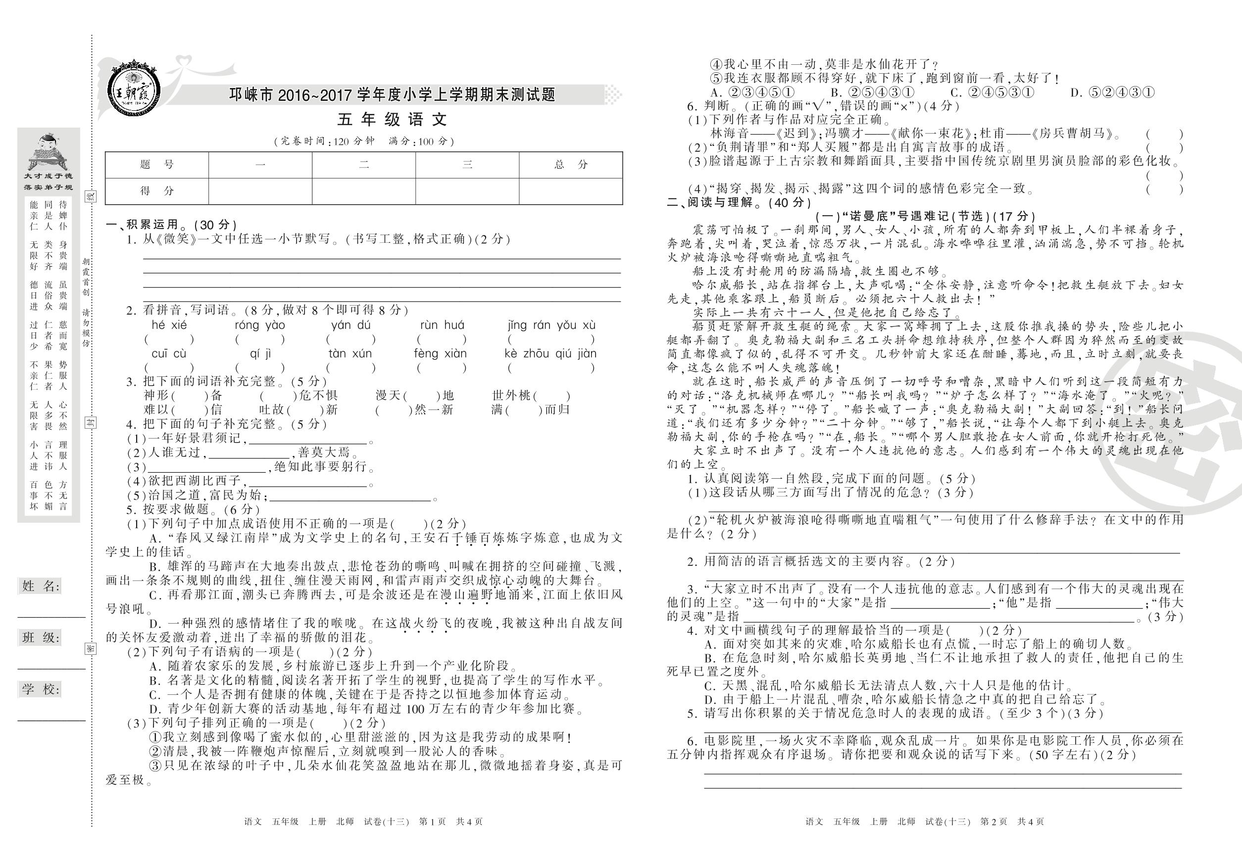 2016-2017学年第一学期邛崃市五年级语文试卷(北师版)【13】