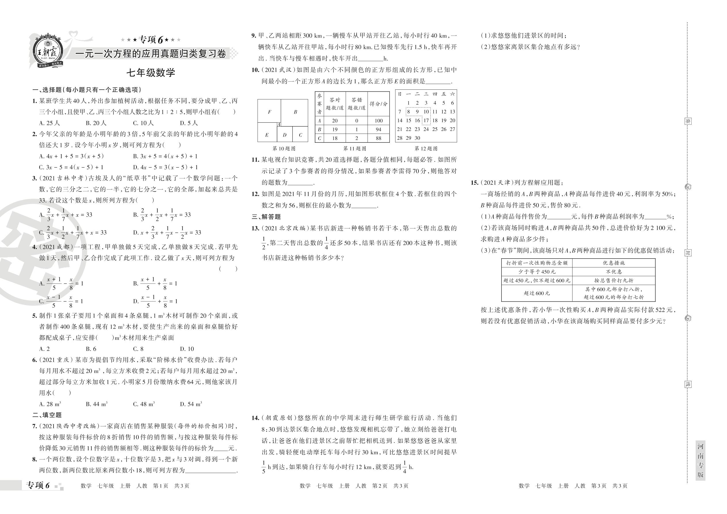 王朝霞期末专项卷——一元一次方程的应用真题归类复习卷七年级上册数学(人教版)_R211225135649887【6】