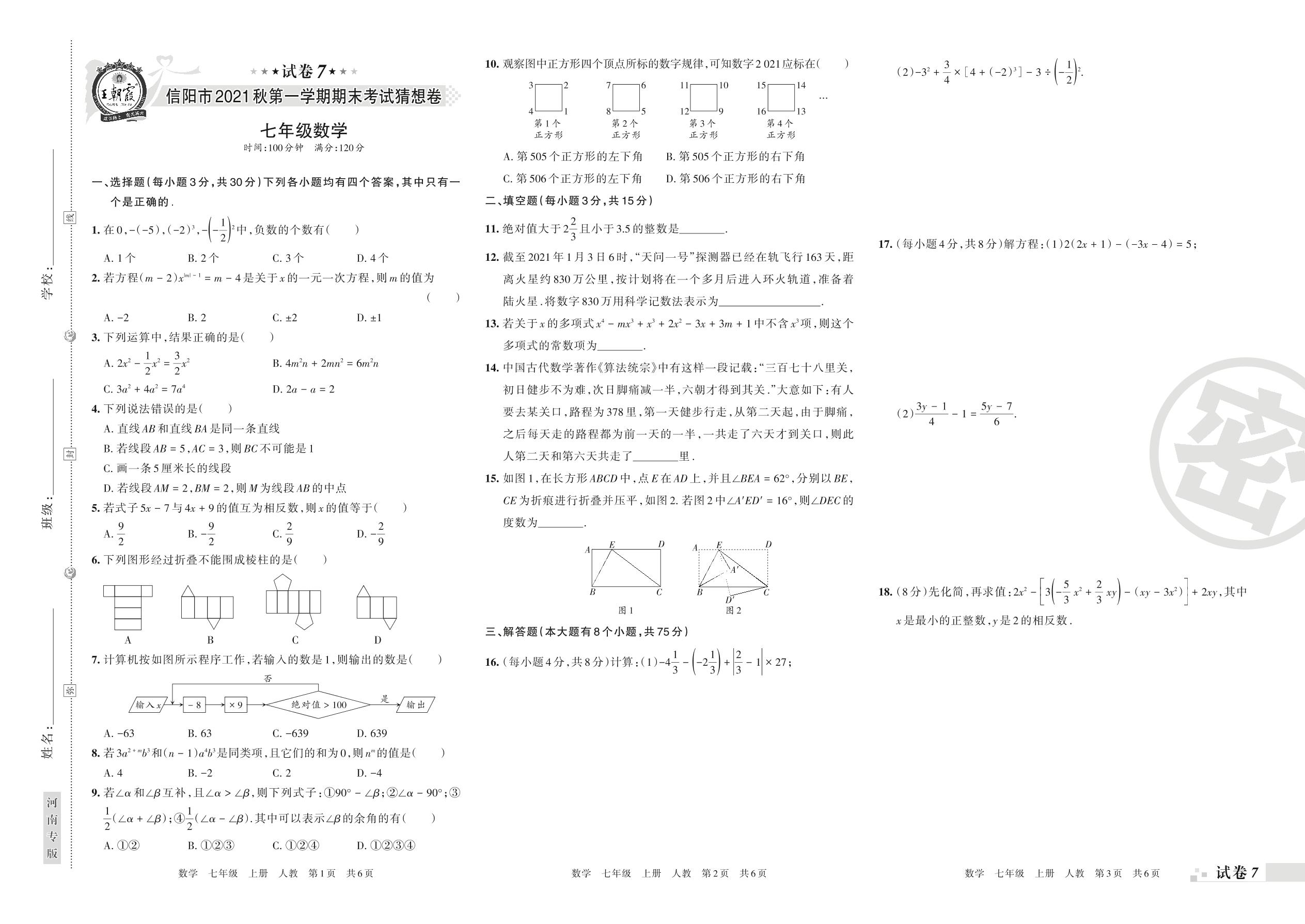 信阳市2021秋第一学期期末考试猜想卷七年级数学(人教版)【7】