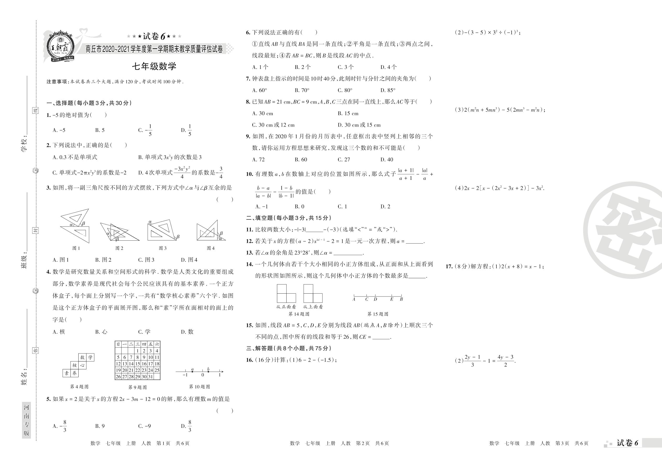 商丘市2020~2021学年度第一学期期末教学质量评估试卷七年级数学(人教版)【6】