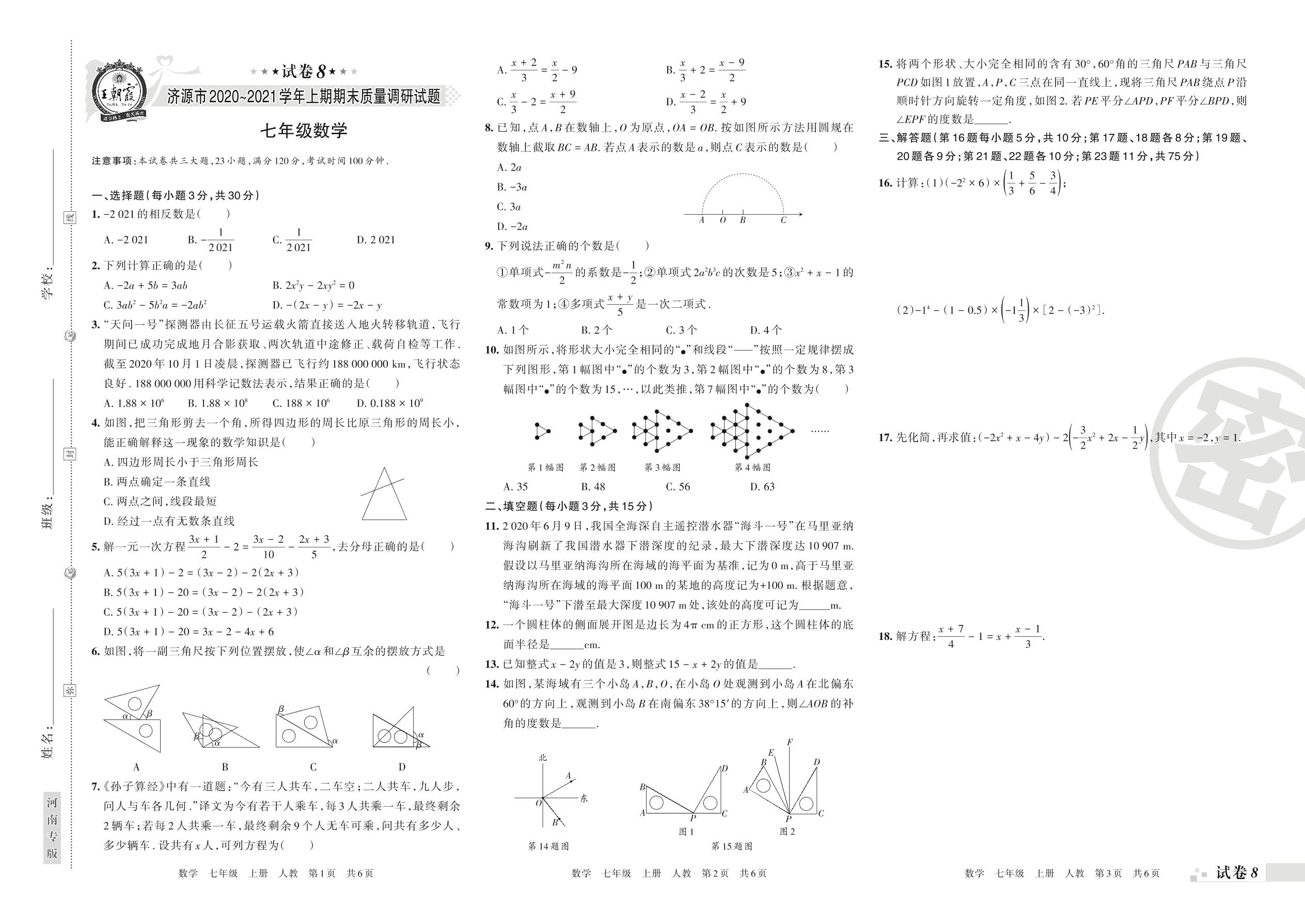 济源市2020~2021学年上期期末质量调研试题七年级数学(人教版)【8】