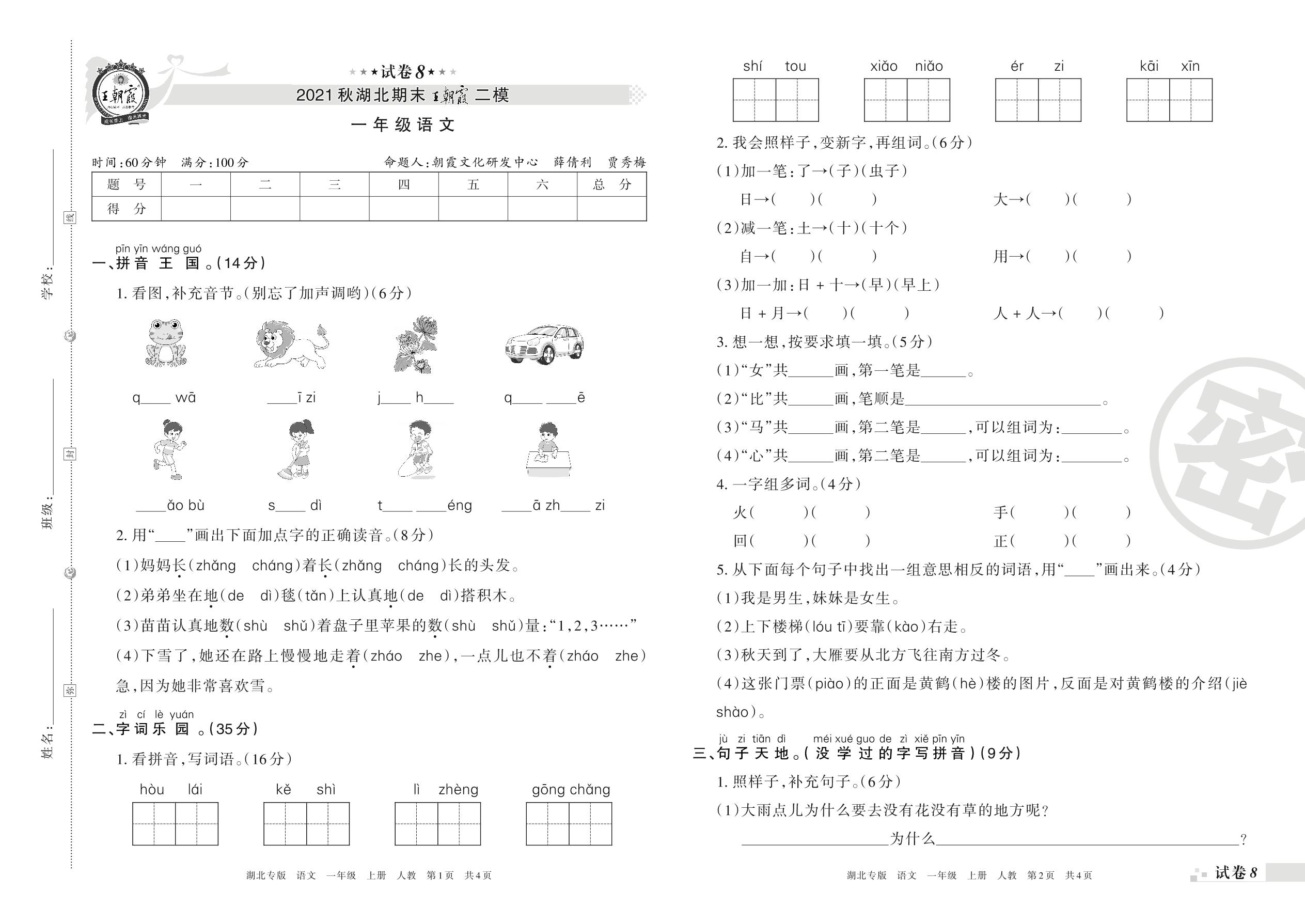 王朝霞期末模拟卷一年级上册语文(人教版)_R211225140115398【8】