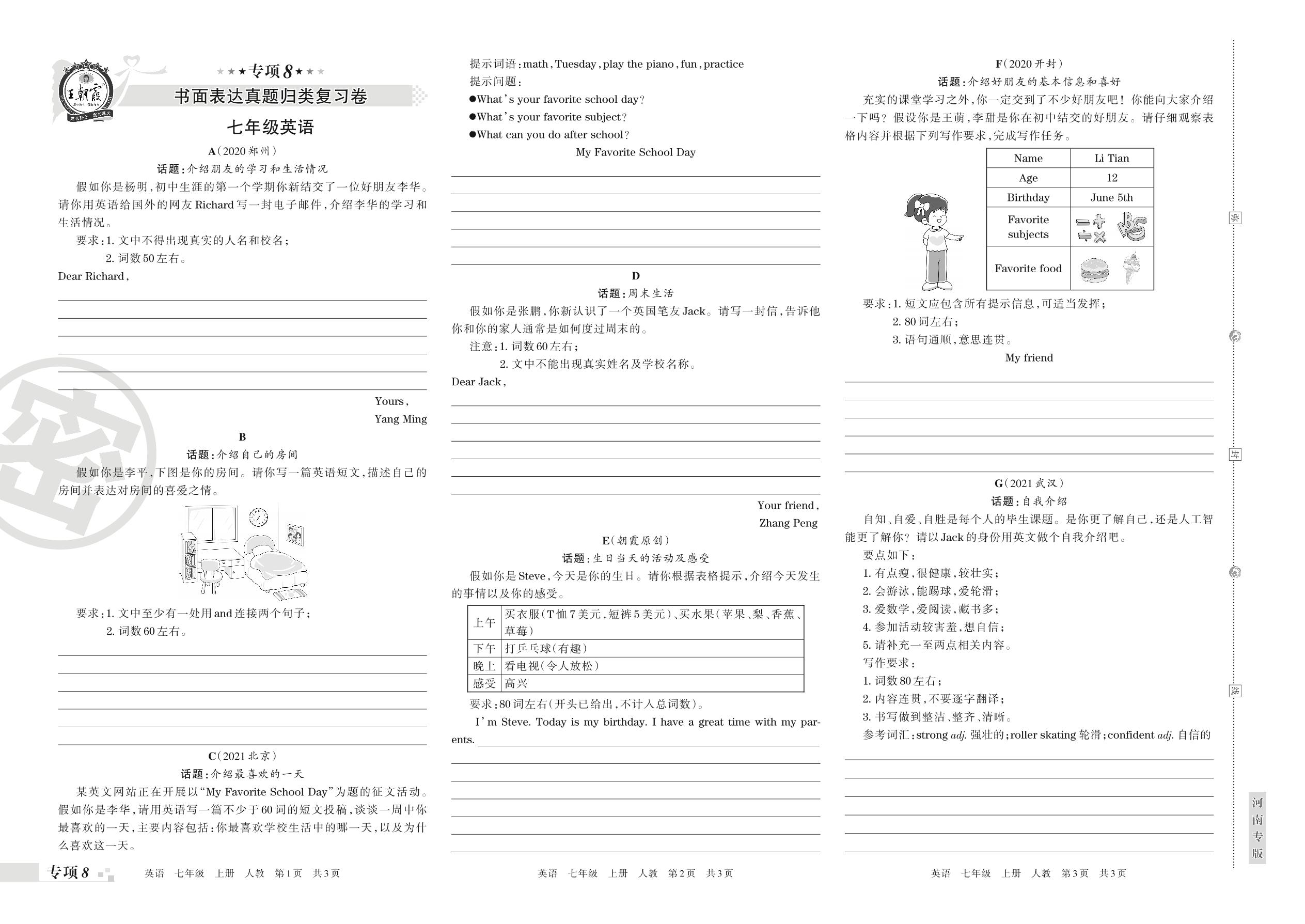 王朝霞期末专项卷——书面表达真题归类复习卷七年级上册英语(人教版)_R211225140132205【8】