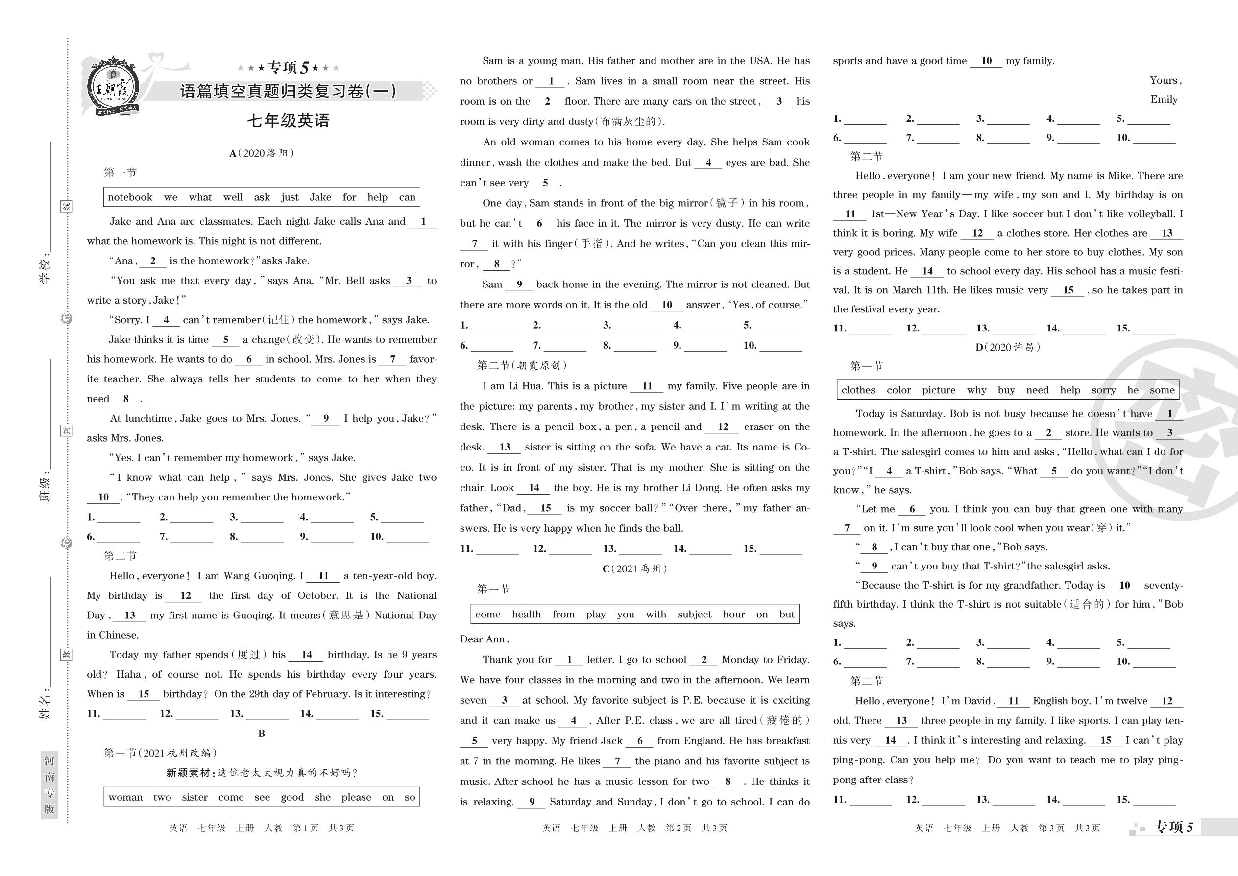 王朝霞期末专项卷——语篇填空真题归类复习卷(一)七年级上册英语(人教版)_R211225140133985【5】