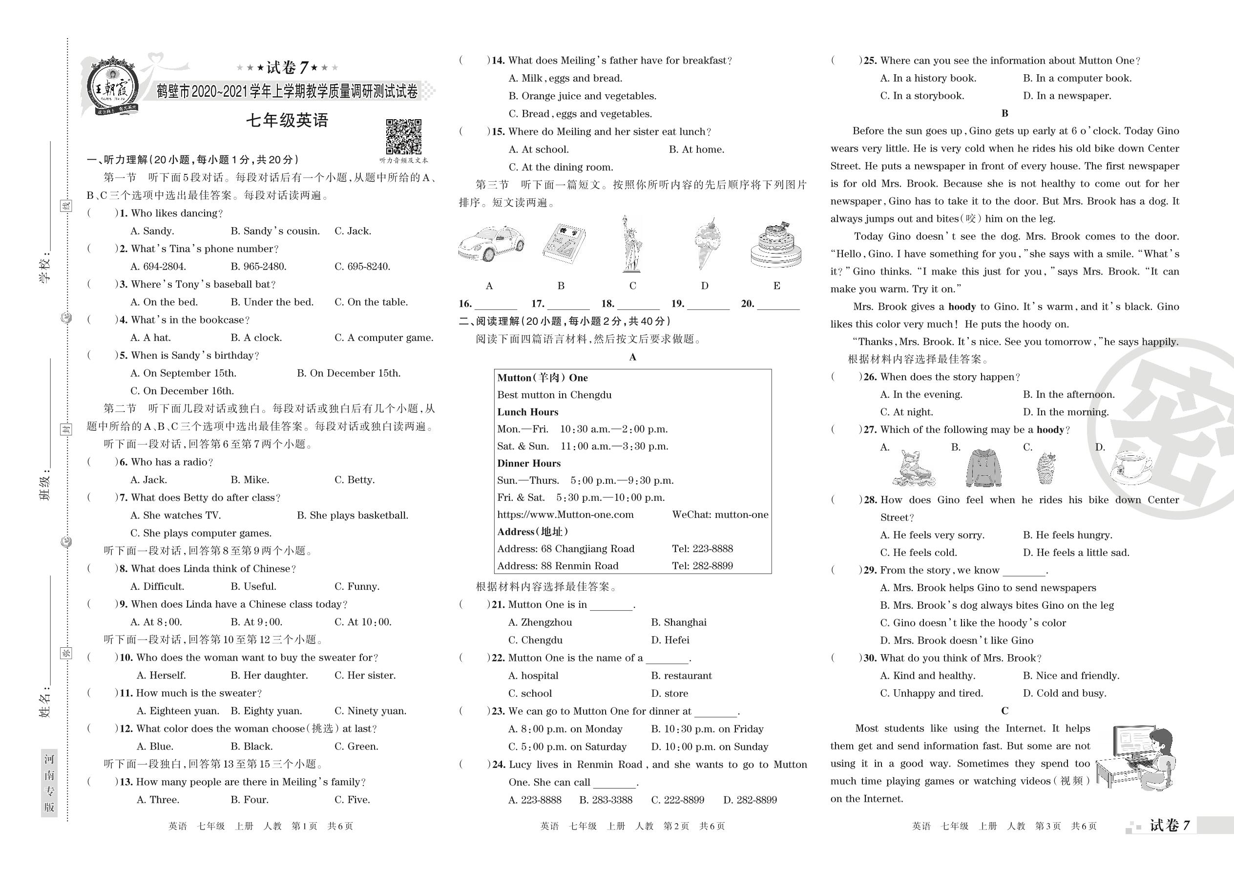 鹤壁市2020~2021学年上学期教学质量调研测试试卷七年级英语(人教版)【7】