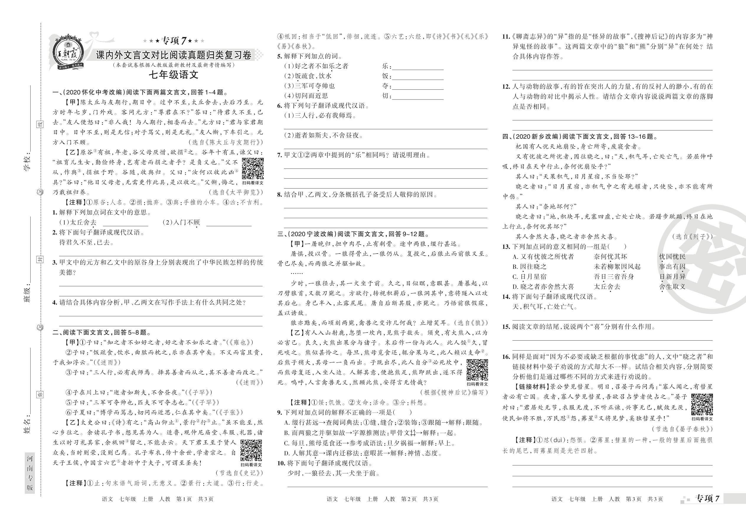 王朝霞期末专项卷——课内外文言文对比阅读真题归类复习卷七年级上册语文(人教版)_R211225140612413【7】