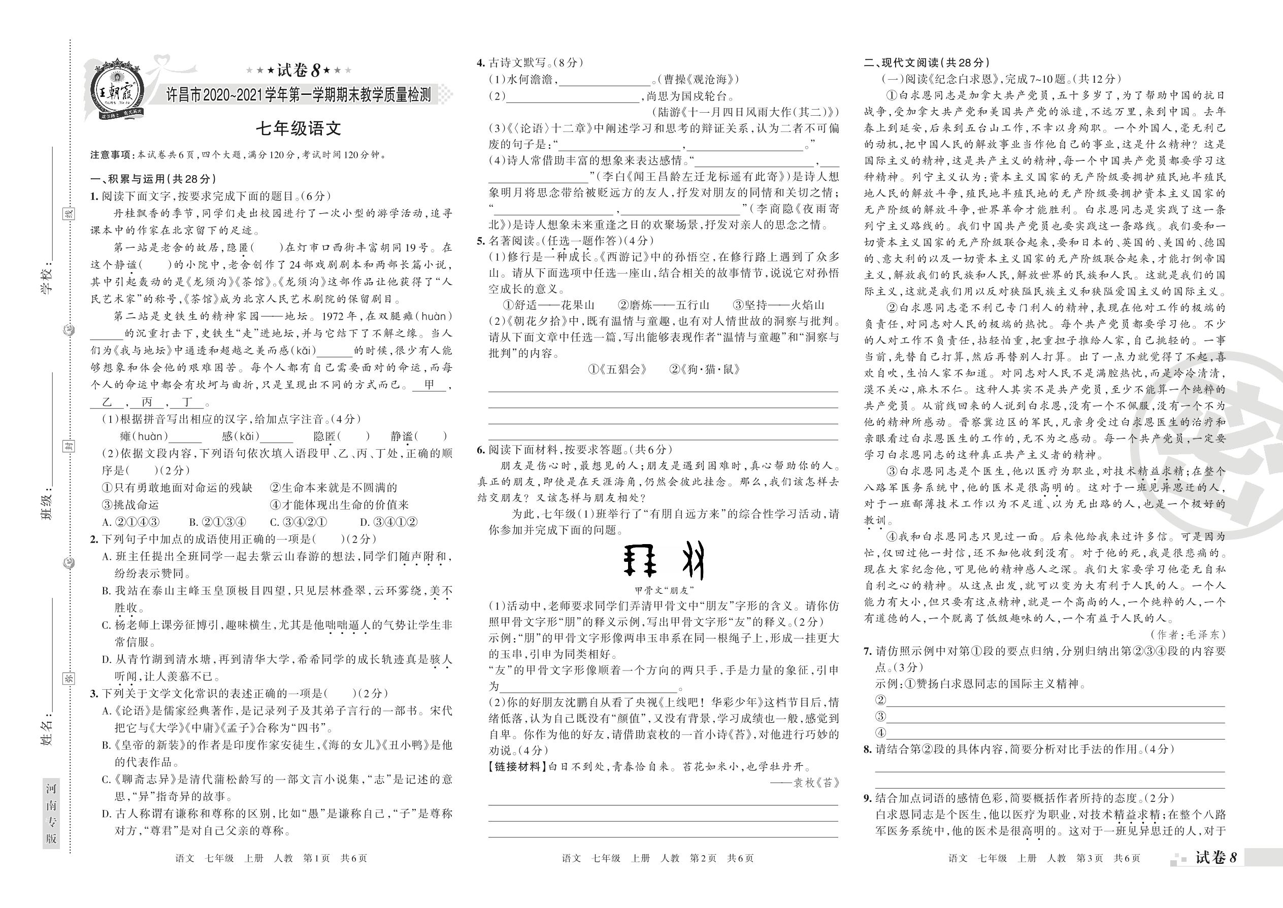 许昌市2020~2021学年第一学期期末教学质量检测七年级语文(人教版)【8】