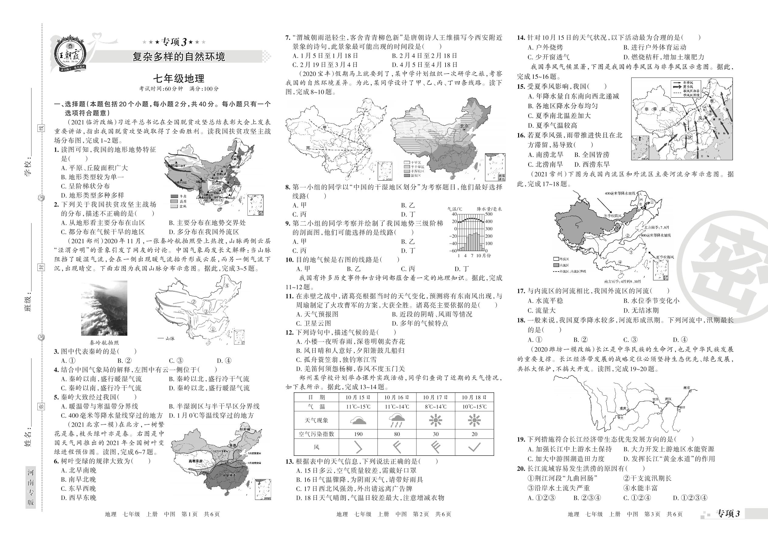 王朝霞期末专项卷——复杂多样的自然环境七年级上册地理(中图版)【3】