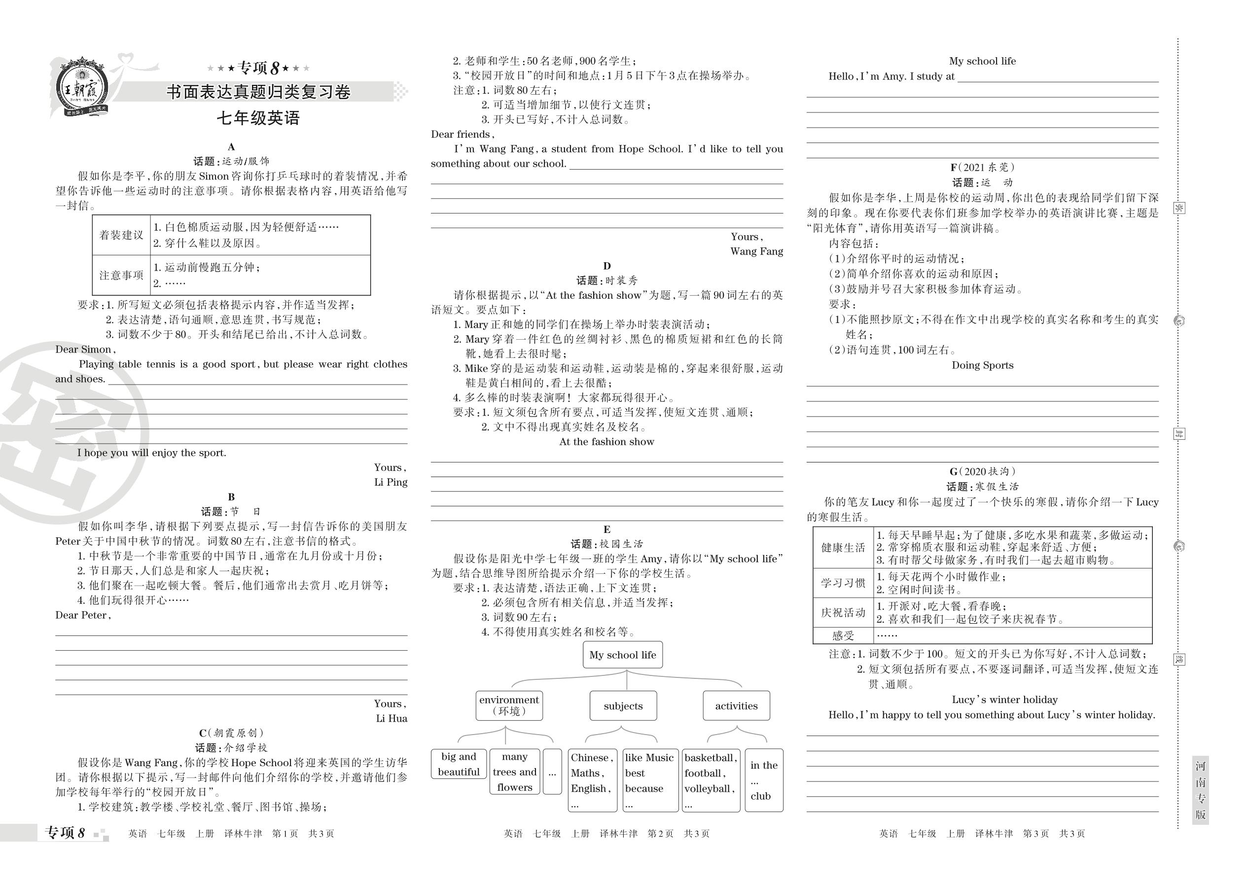 王朝霞期末专项卷——书面表达真题归类复习卷七年级上册英语(译林牛津版)_R211225141122063【8】