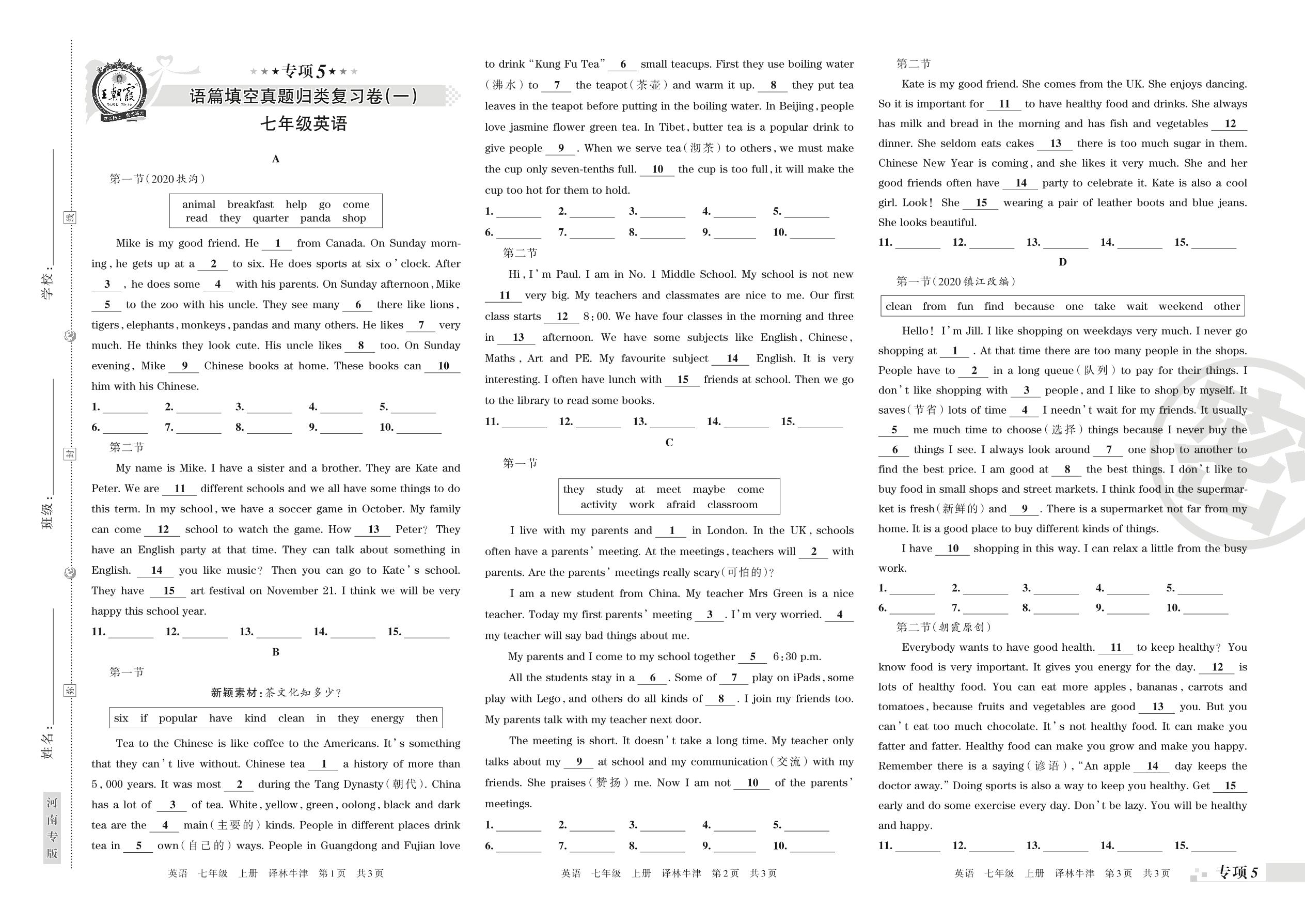 王朝霞期末专项卷——语篇填空真题归类复习卷(一)七年级上册英语(译林牛津版)【5】