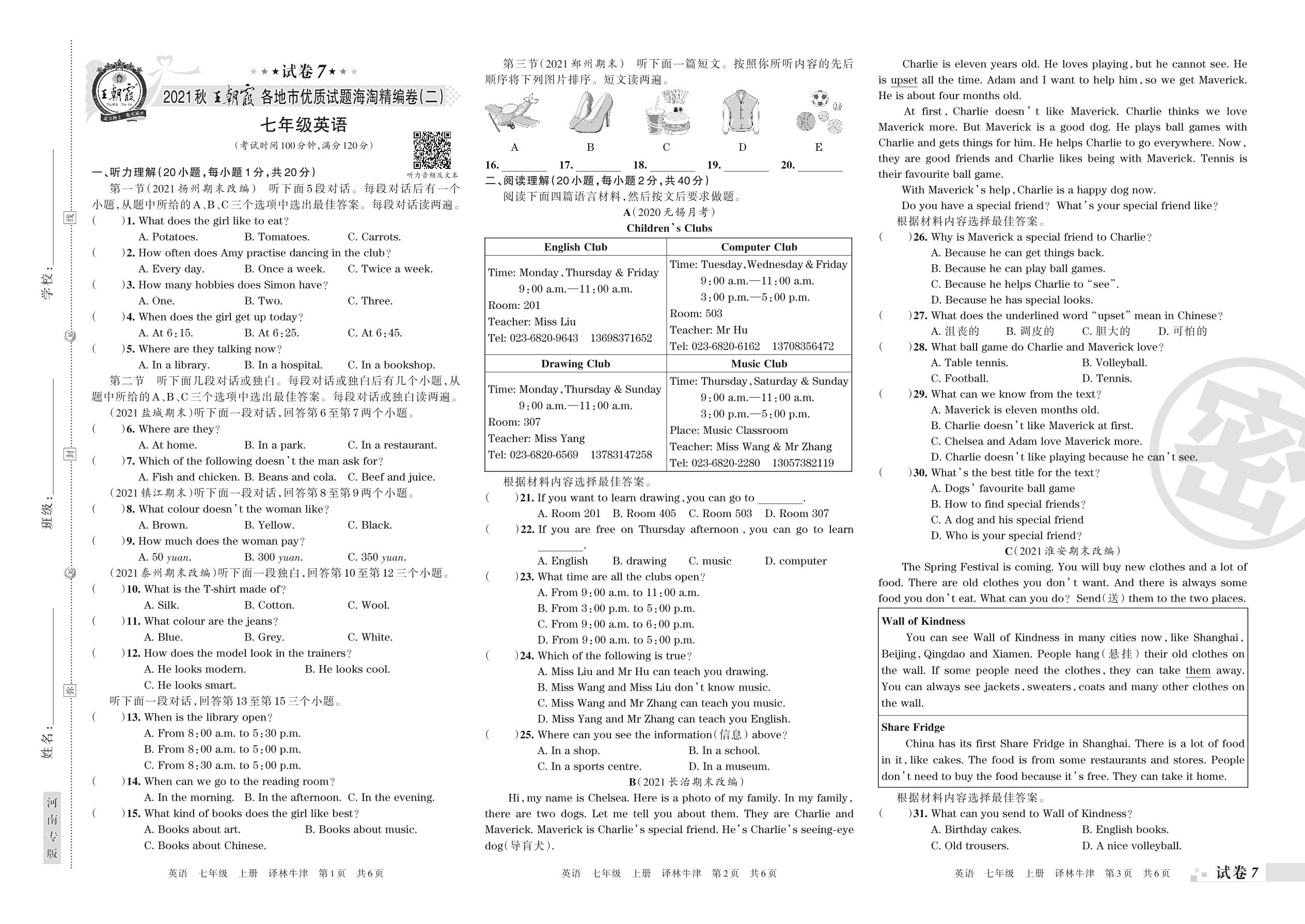 2021秋王朝霞各地市优质试题海淘精编卷(二)七年级英语(译林牛津版)【7】