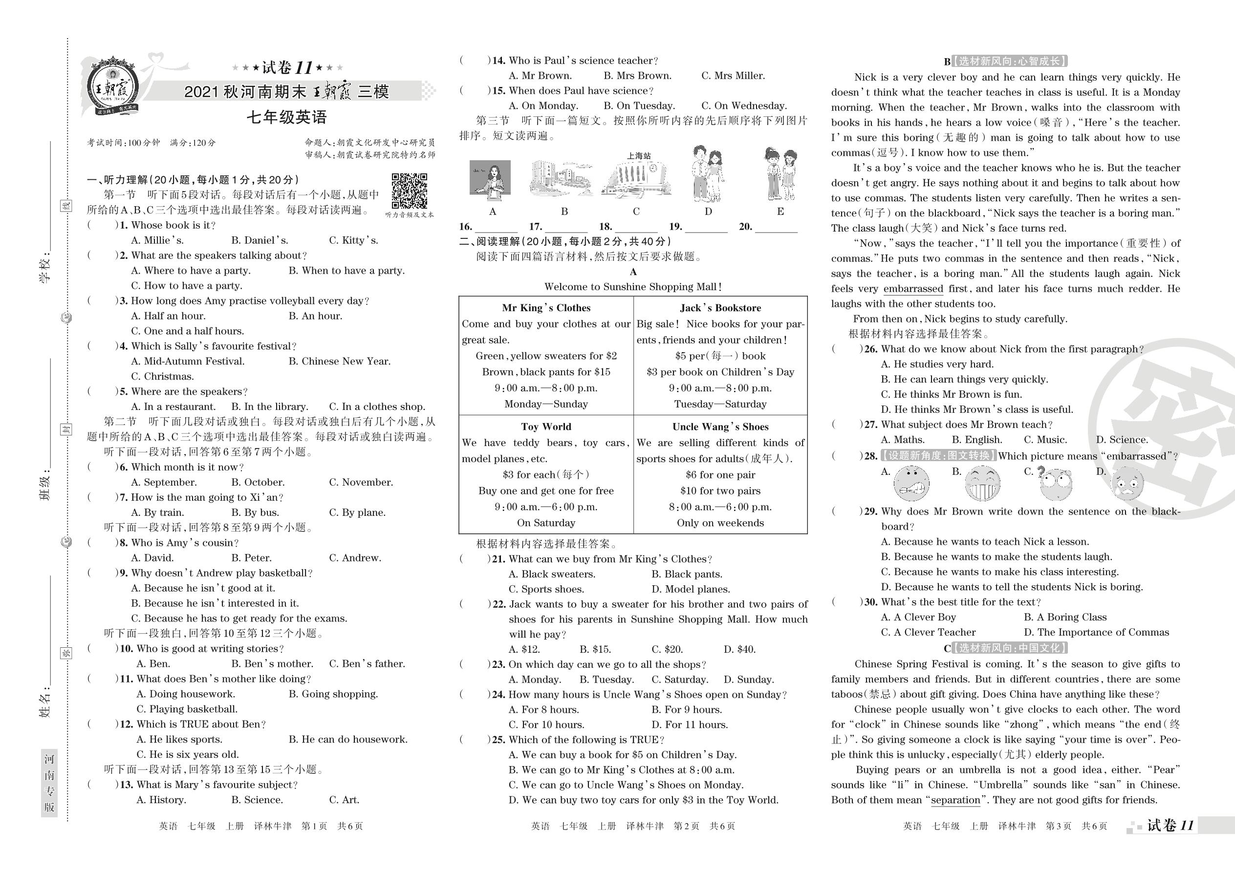 王朝霞期末模拟卷七年级上册英语(译林牛津版)【11】
