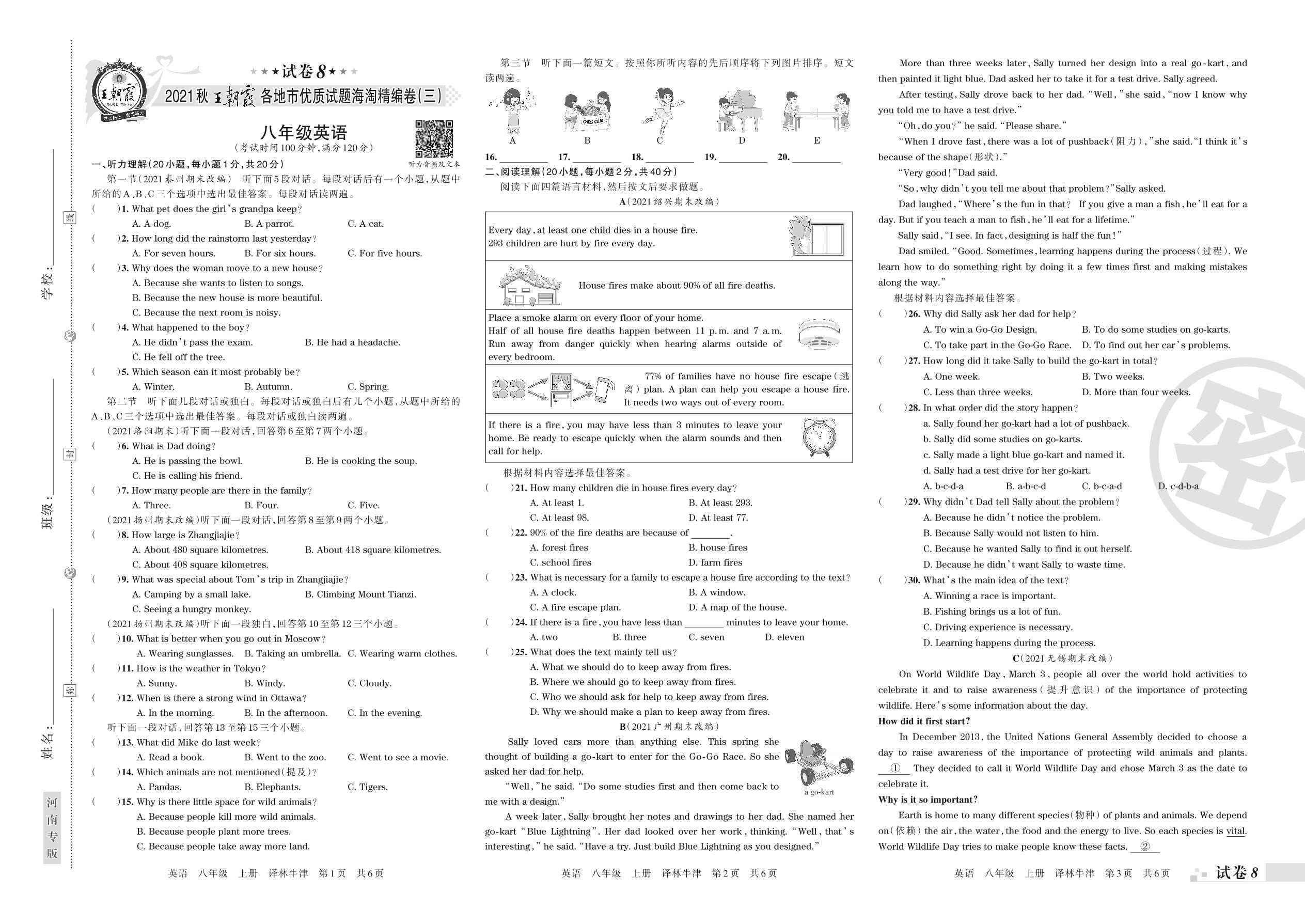 2021秋王朝霞各地市优质试题海淘精编卷(三)八年级英语(译林牛津版)【8】