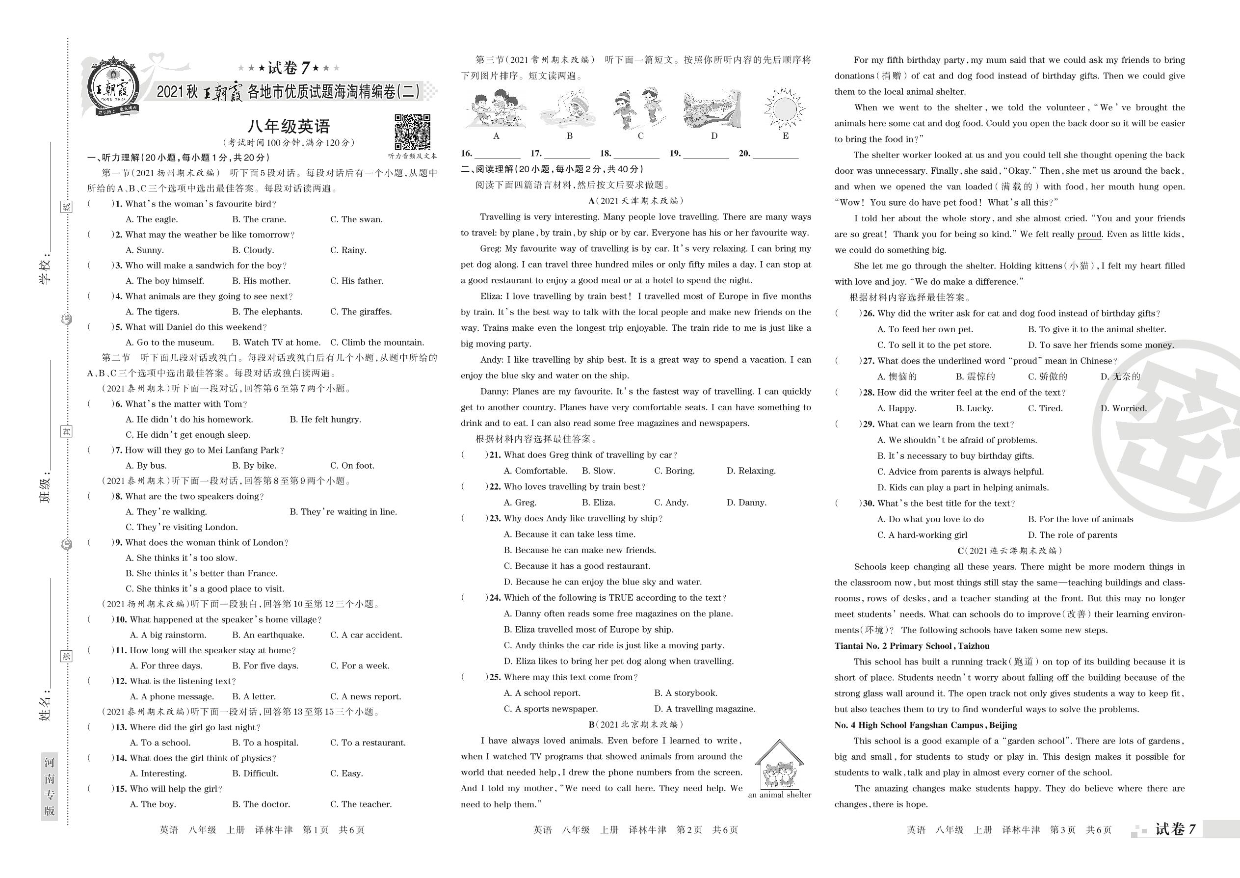 2021秋王朝霞各地市优质试题海淘精编卷(二)八年级英语(译林牛津版)【7】