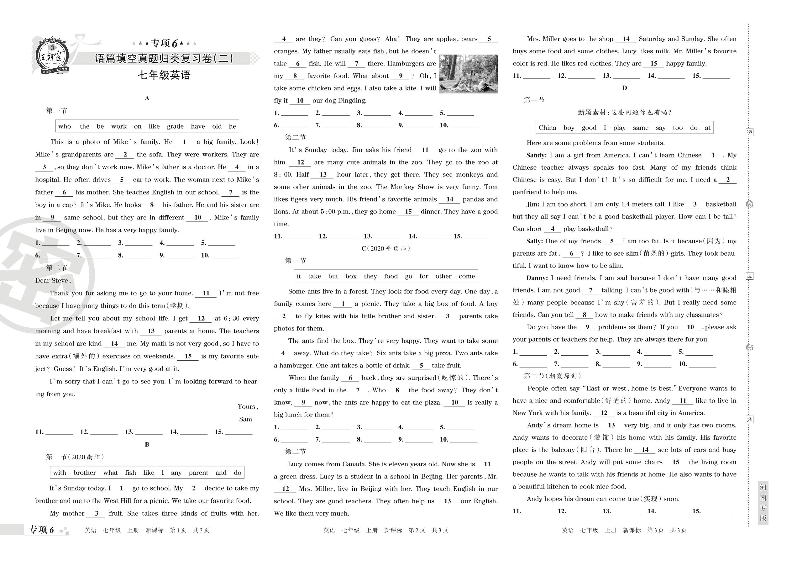 王朝霞期末专项卷——语篇填空真题归类复习卷(二)七年级上册英语(新课标版)_R211225142243408【6】