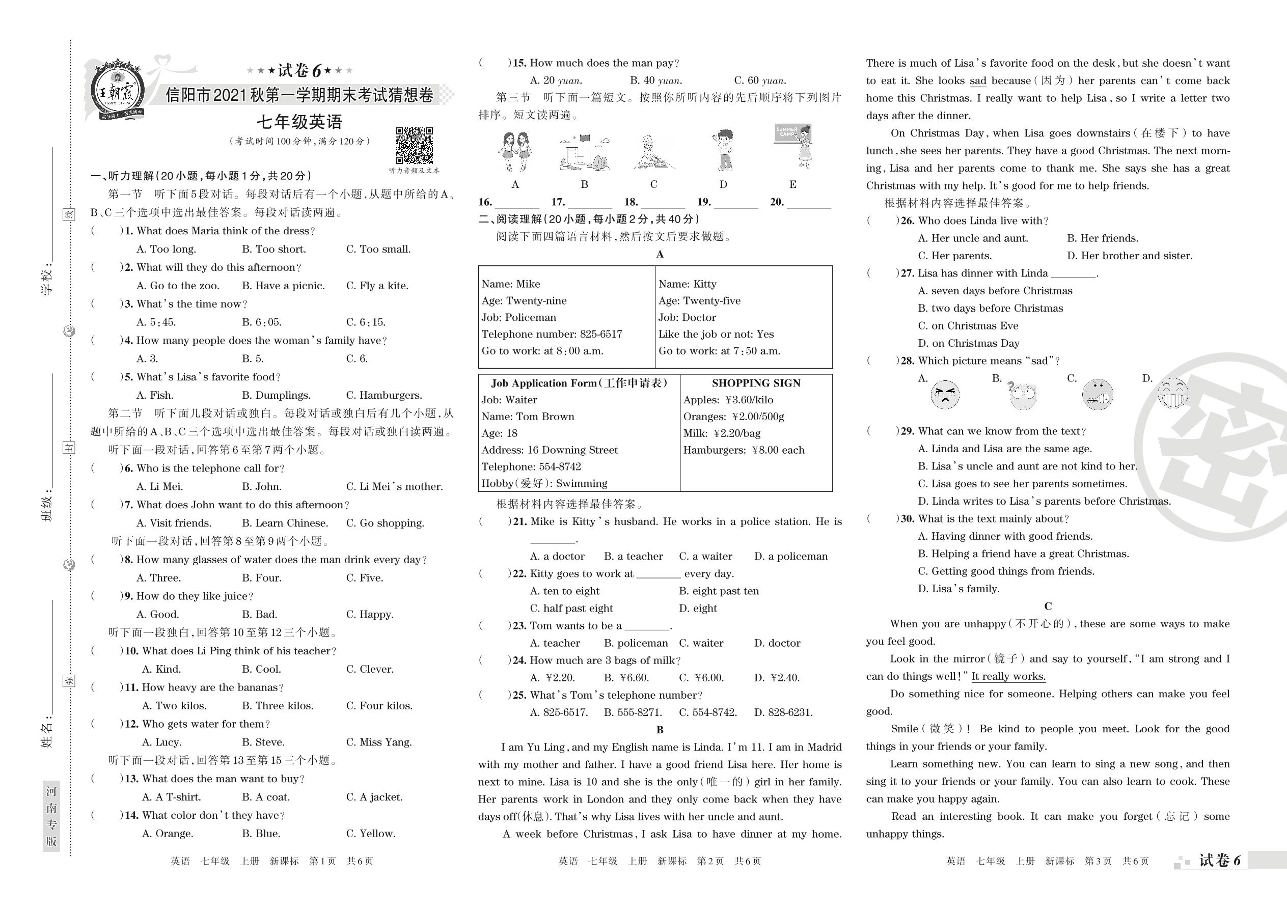 信阳市2021秋第一学期期末考试猜想卷七年级英语(新课标版)【6】