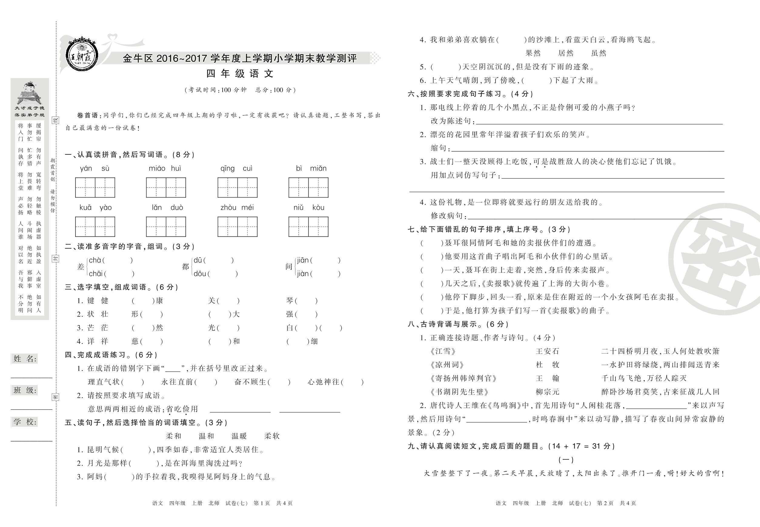 2016-2017学年第一学期成都市金牛区四年级语文试卷(北师版)【7】