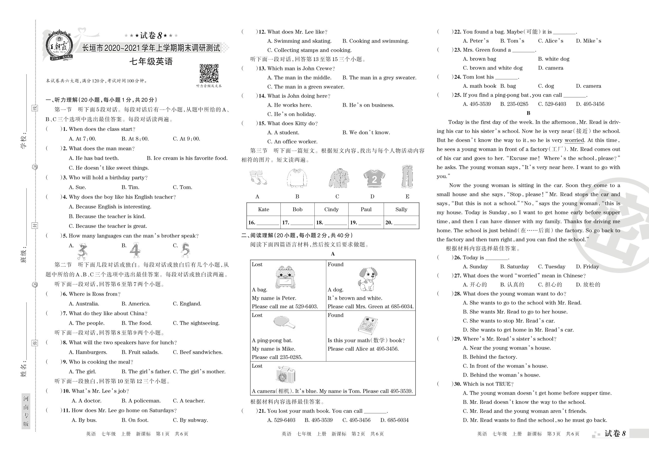 长垣市2020~2021学年上学期期末调研测试七年级英语(新课标版)【8】