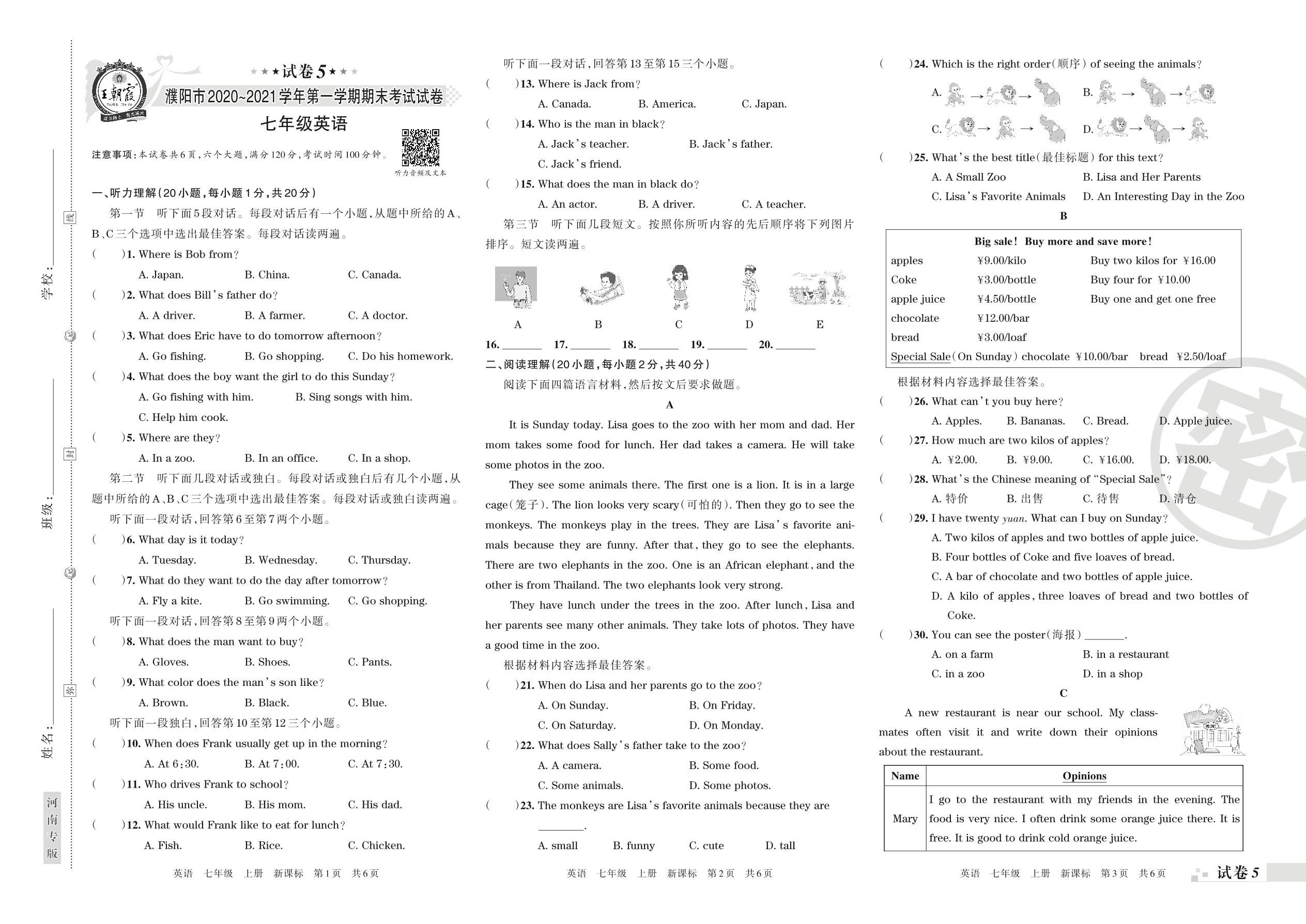 濮阳市2020~2021学年第一学期期末考试试卷七年级英语(新课标版)【5】