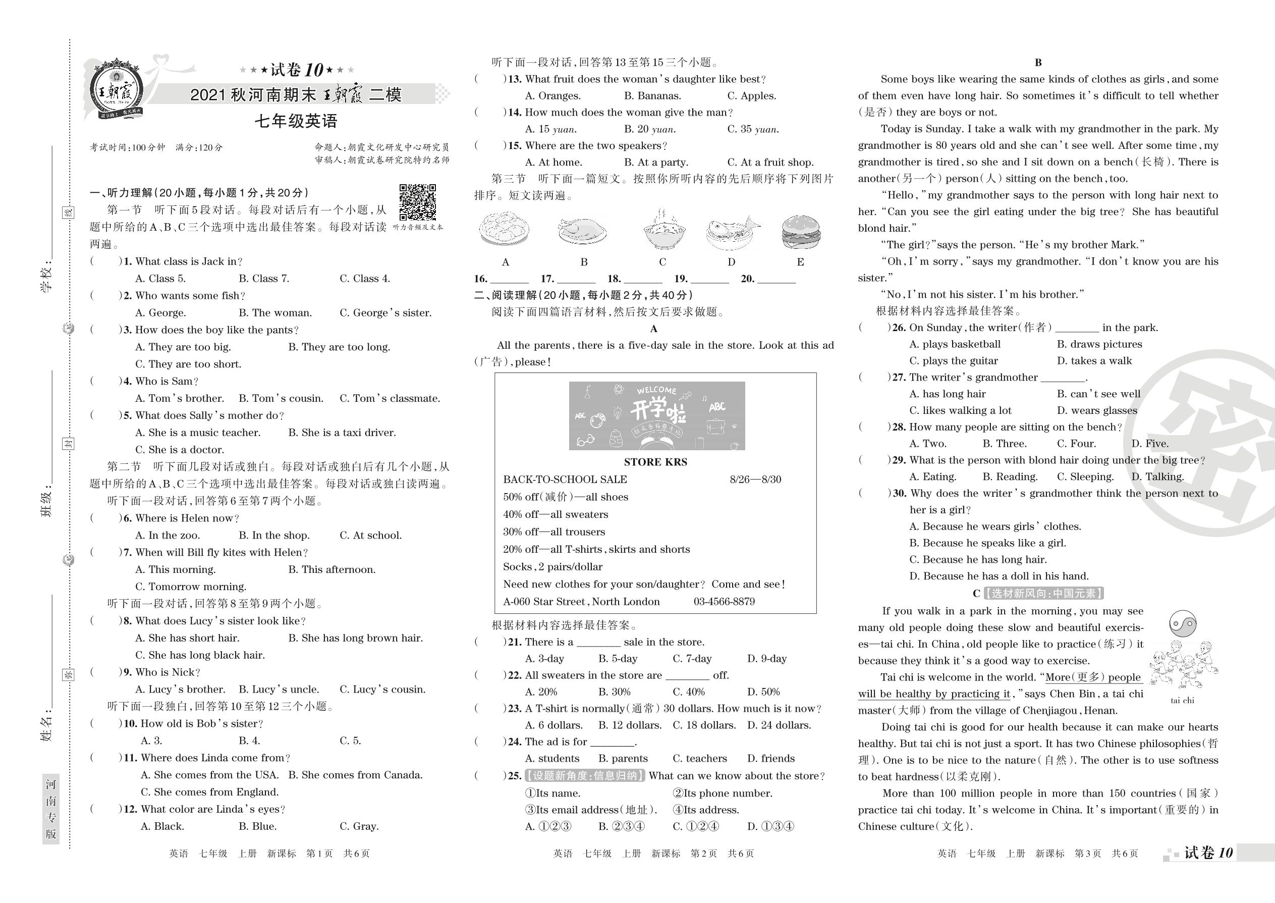 王朝霞期末模拟卷七年级上册英语(新课标版)_R211225142243278【10】