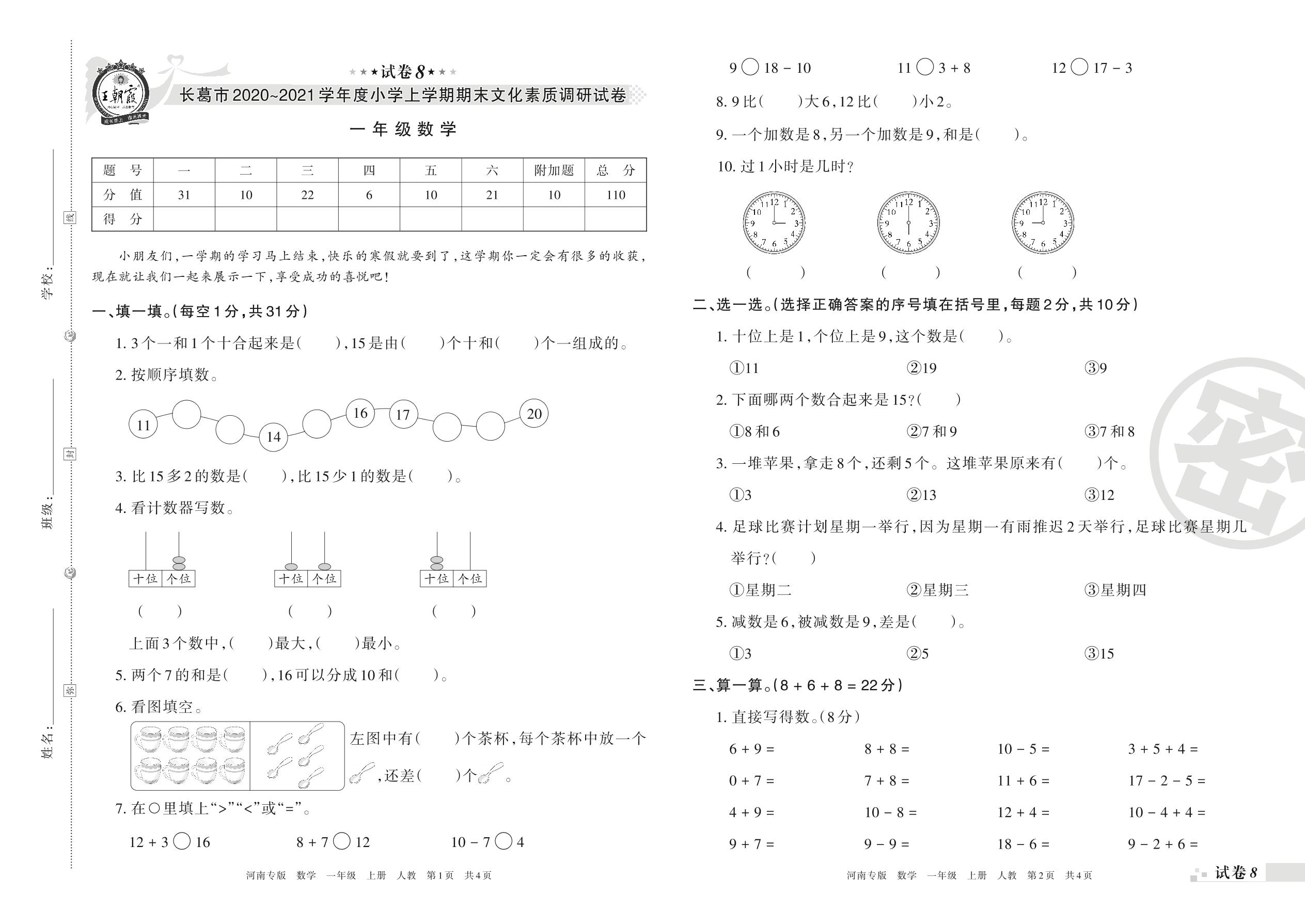长葛市2020~2021学年度小学上学期期末文化素质调研试卷一年级数学(人教版)【8】