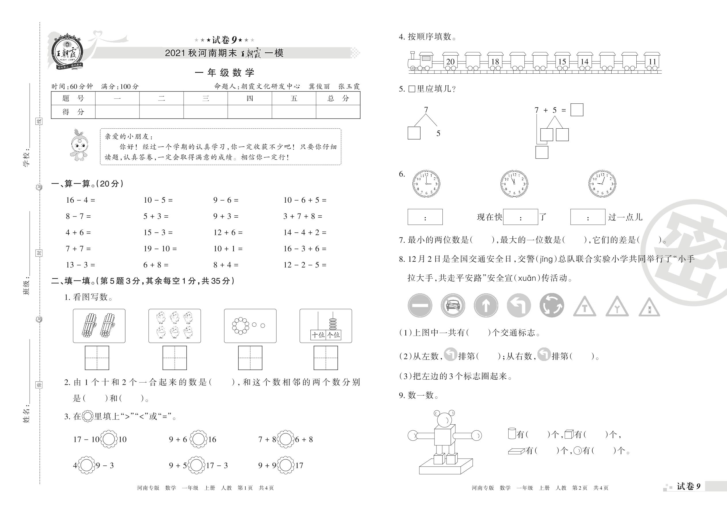 王朝霞期末模拟卷一年级上册数学(人教版)_R211225152756697【9】