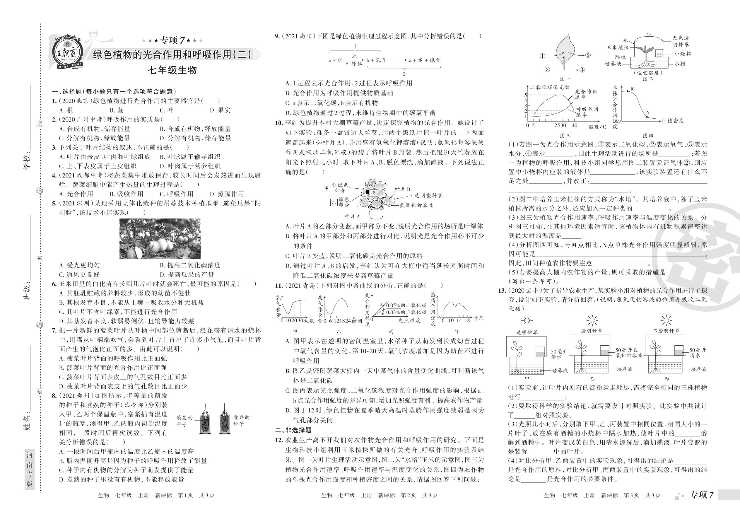 王朝霞期末专项卷——绿色植物的光合作用和呼吸作用(二)七年级上册生物(新课标版)【7】