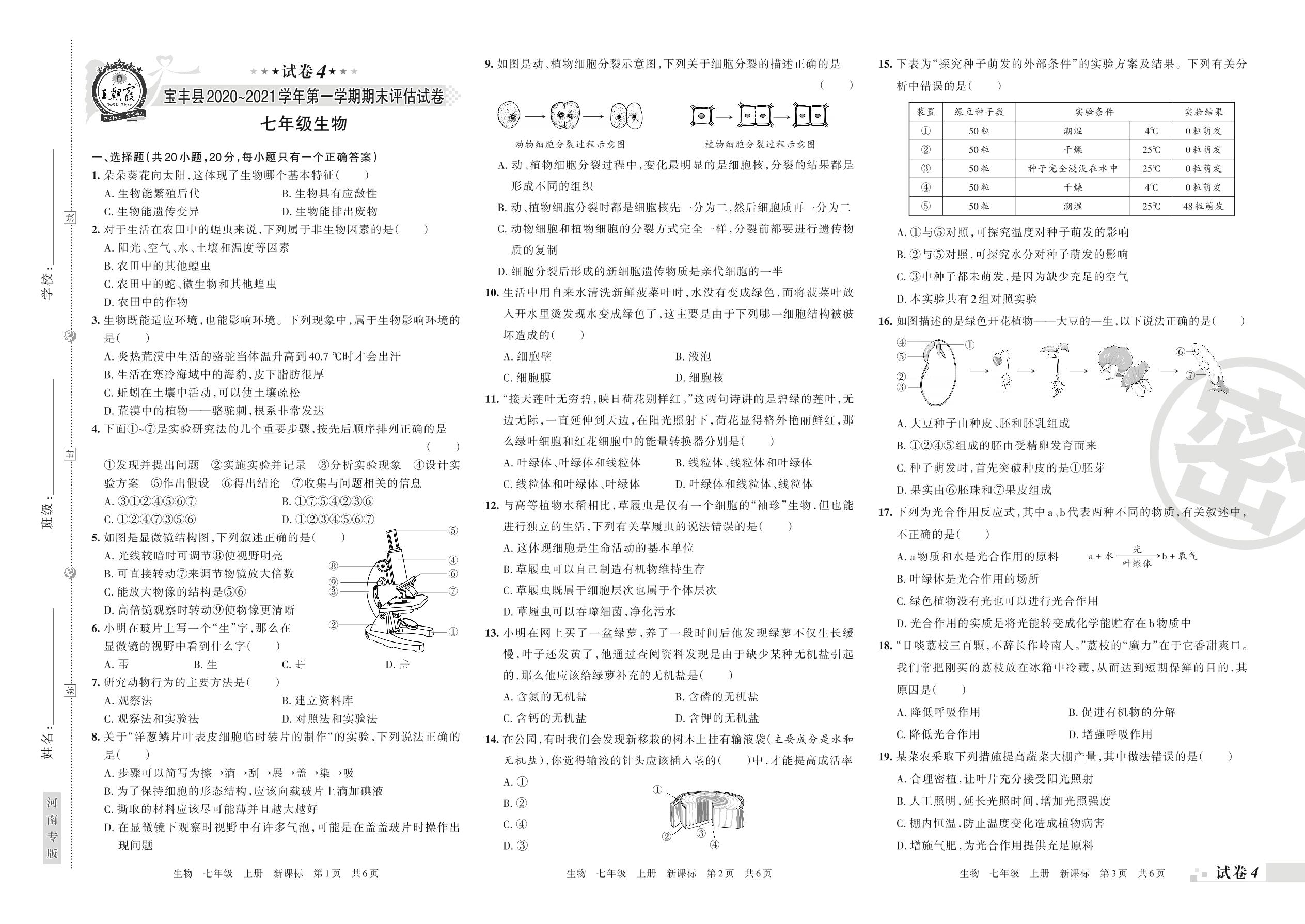 宝丰县2020~2021学年第一学期期末评估试卷七年级生物(新课标版)【4】