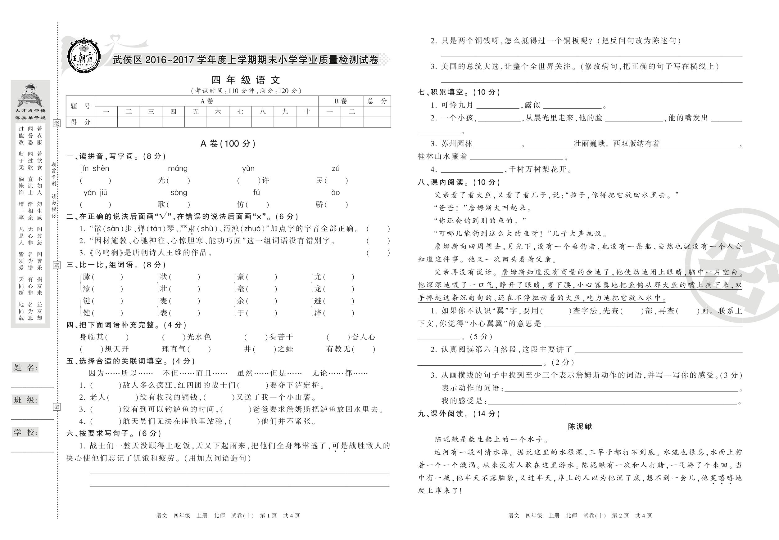 2016-2017学年第一学期成都市武侯区四年级语文试卷(北师版)【10】