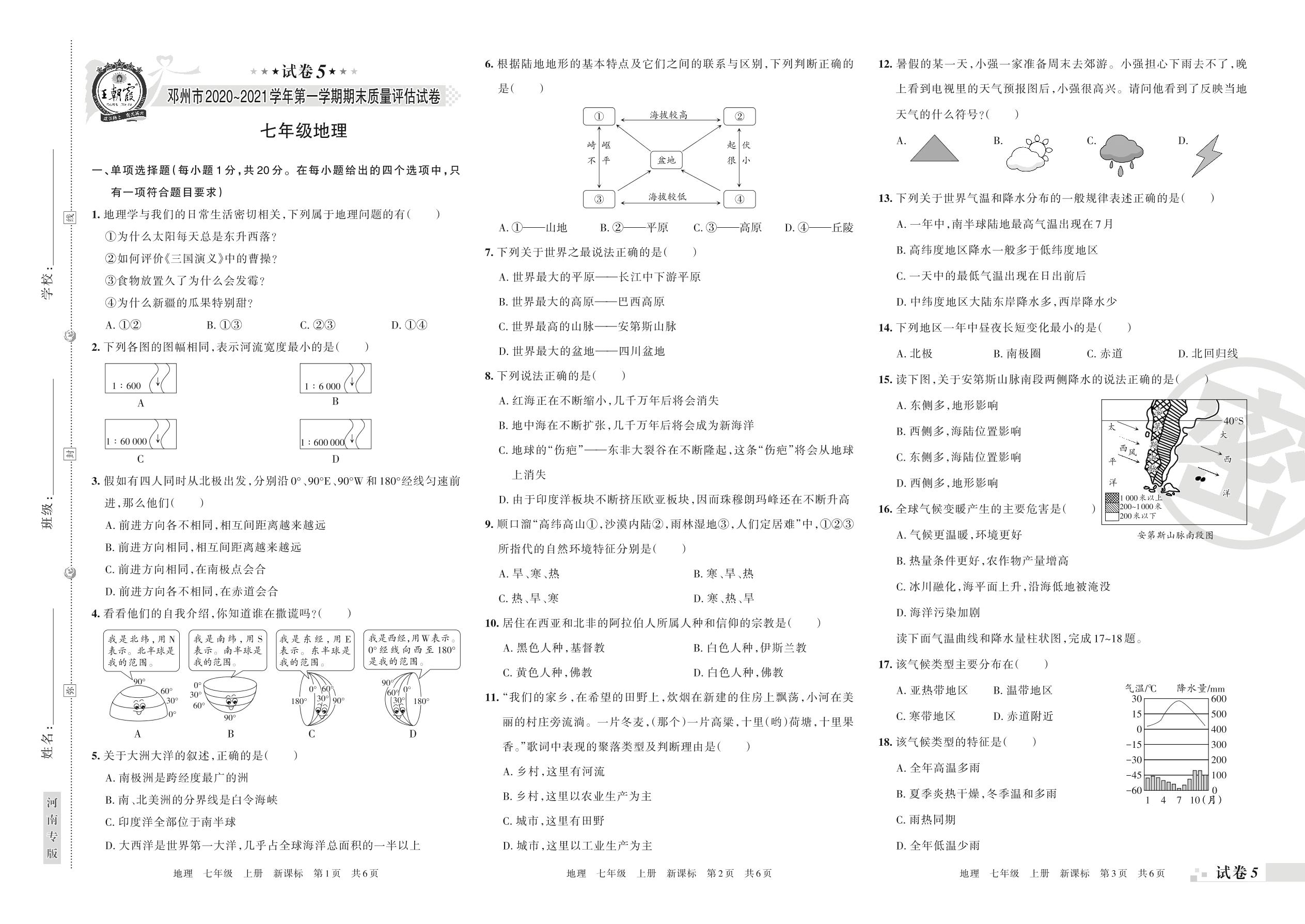邓州市2020~2021学年第一学期期末质量评估试卷七年级地理(新课标版)【5】
