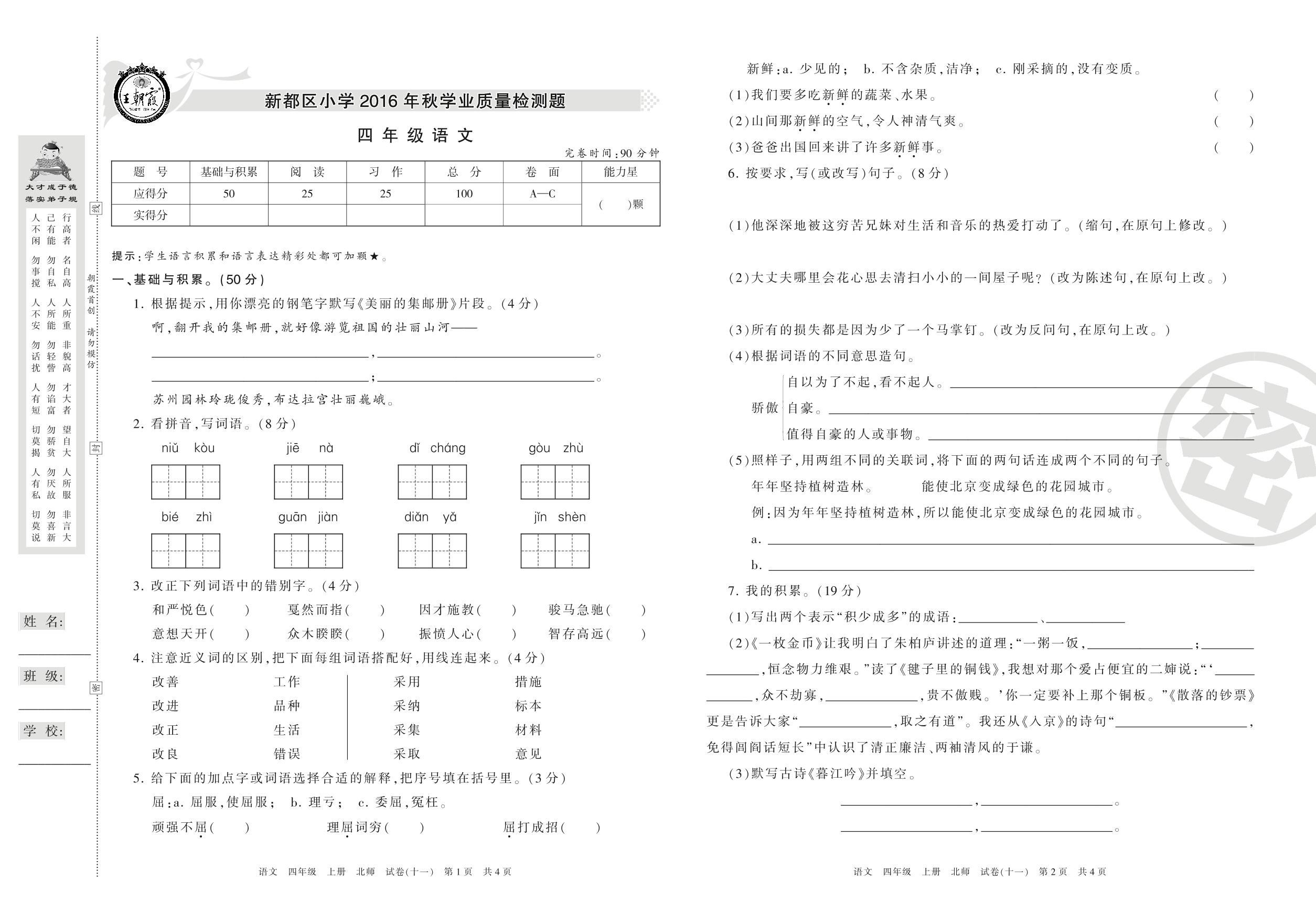 2016-2017学年第一学期成都市新都区四年级语文试卷(北师版)【11】