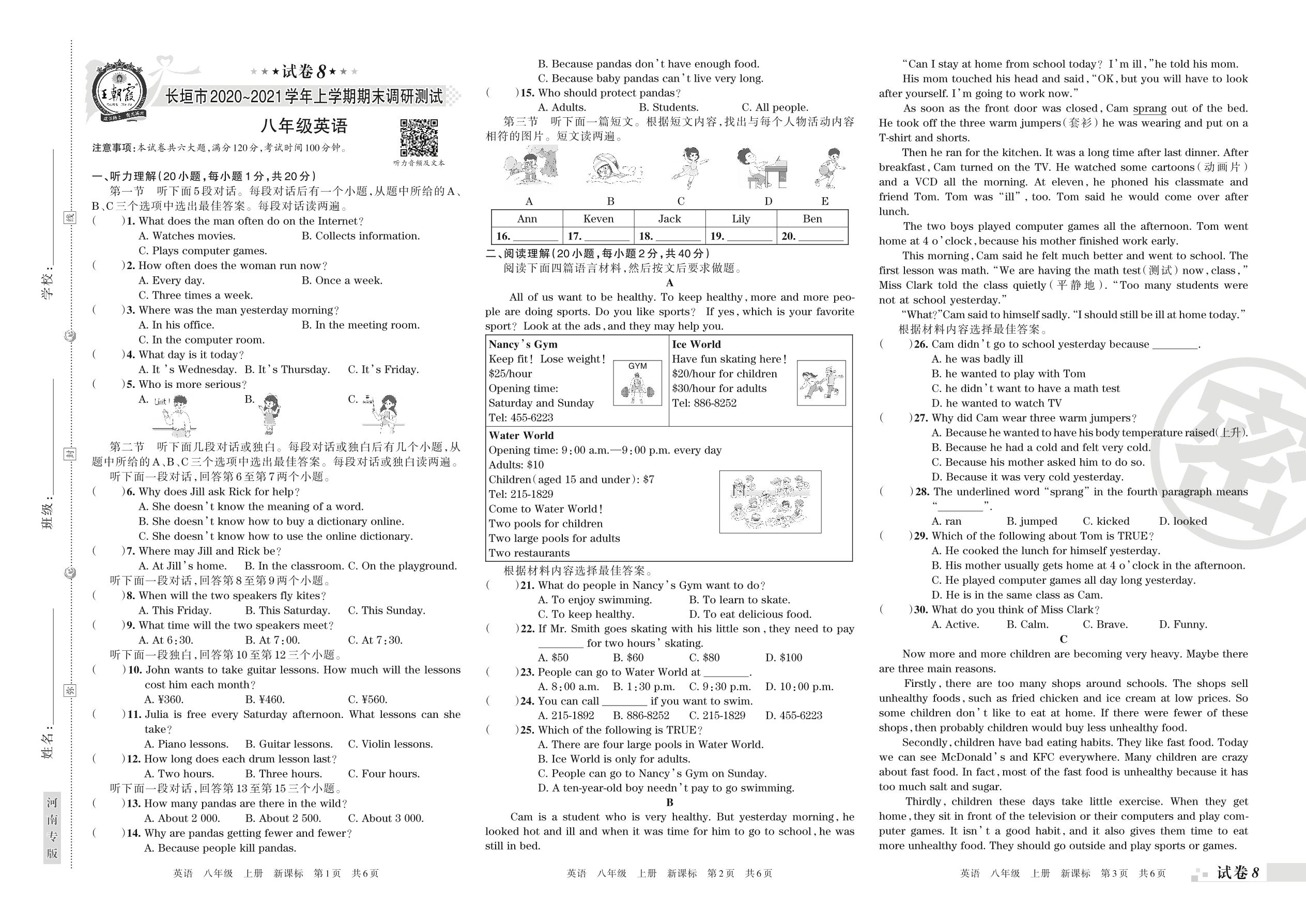 长垣市2020~2021学年上学期期末调研测试八年级英语(新课标版)【8】