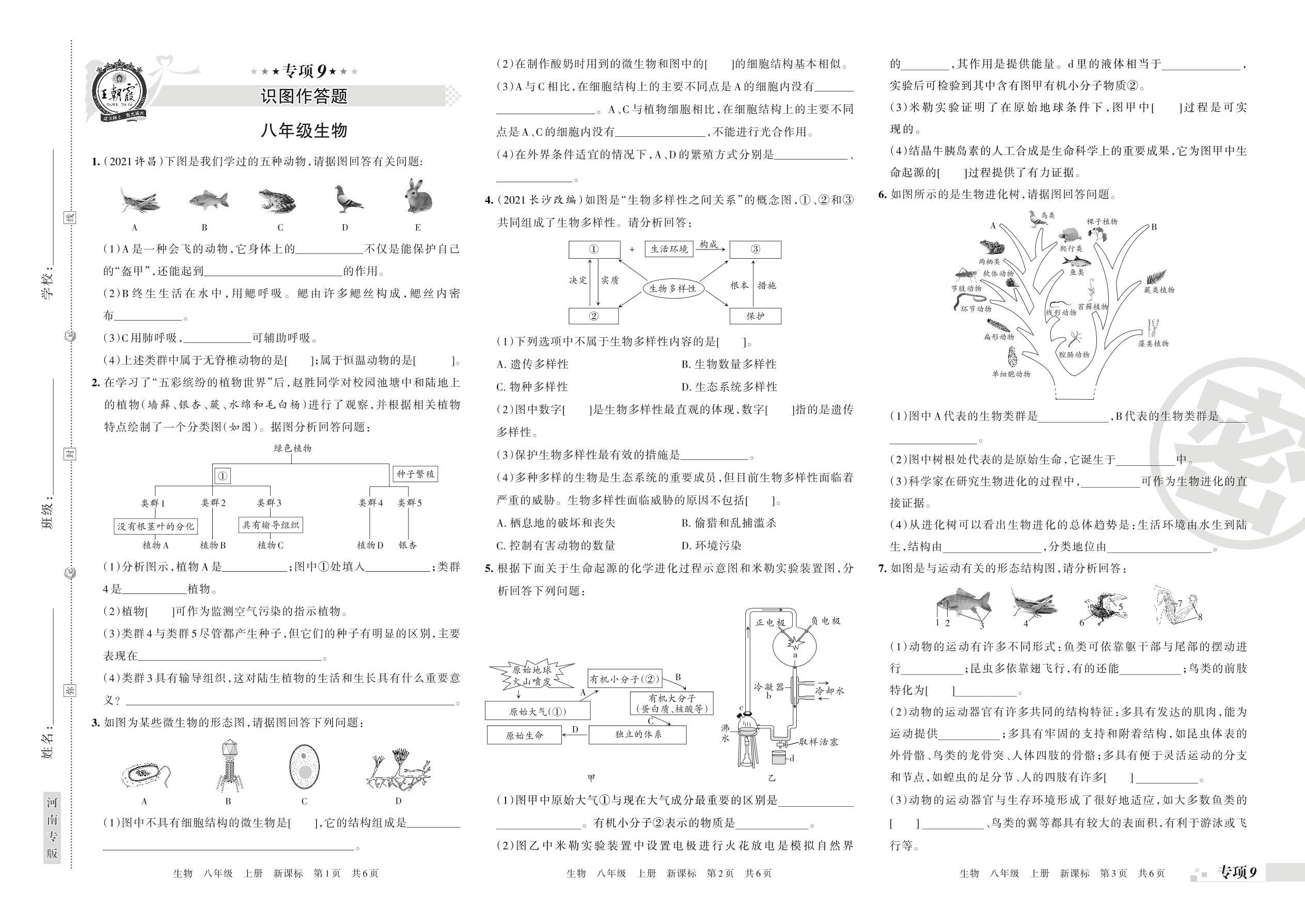 王朝霞期末专项卷——识图作答题八年级上册生物(新课标版)【9】