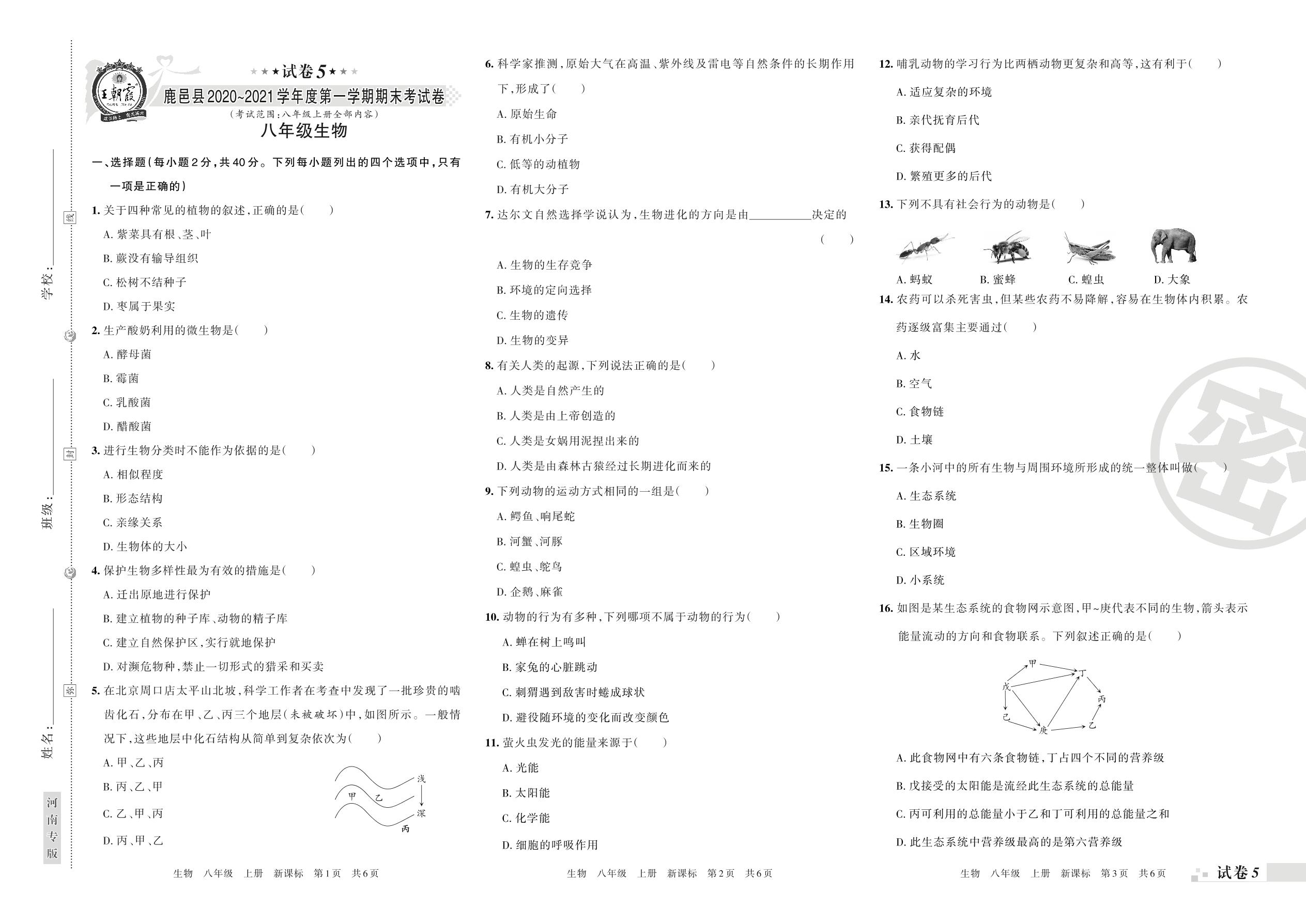 鹿邑县2020~2021学年度第一学期期末考试卷八年级生物(新课标版)【5】