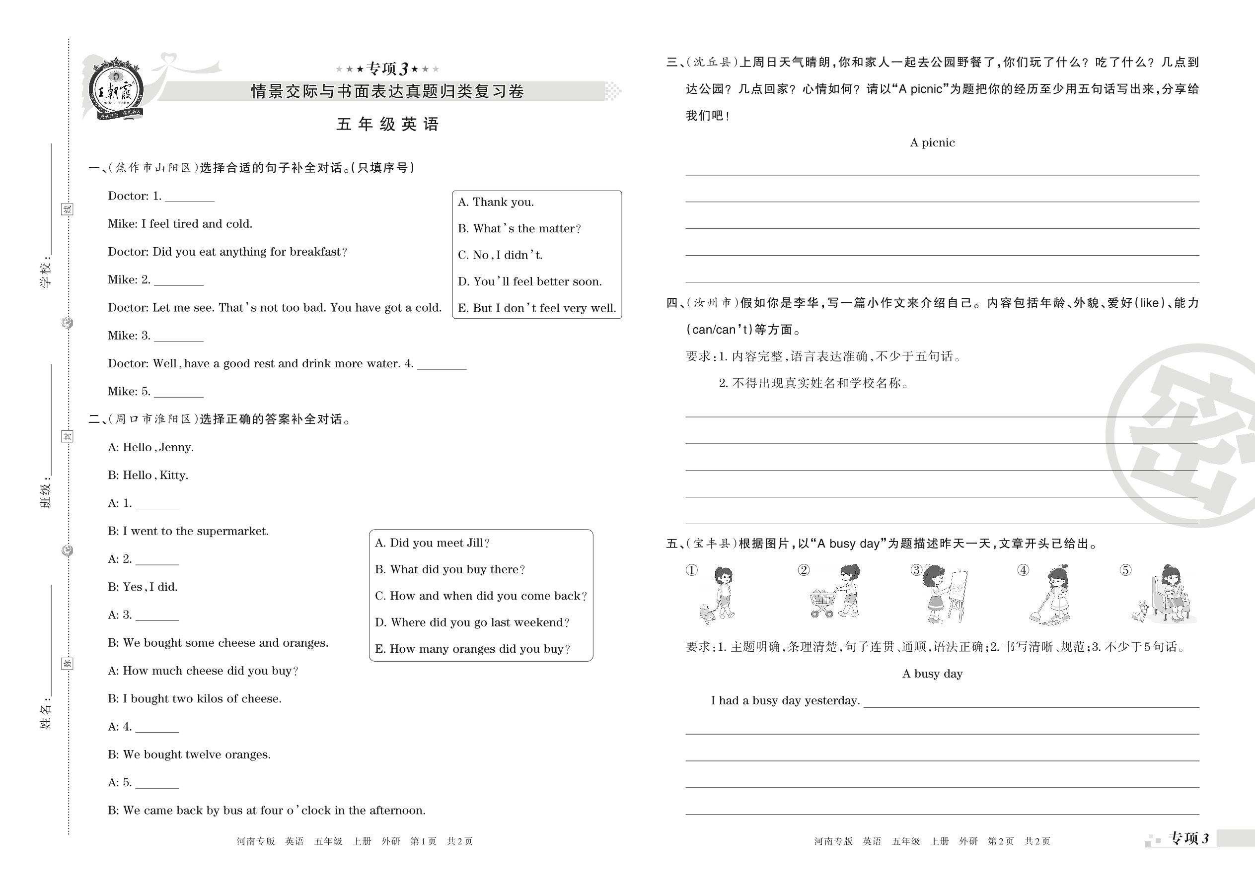 王朝霞期末专项卷——情景交际与书面表达真题归类复习卷五年级上册英语(外研版)【3】