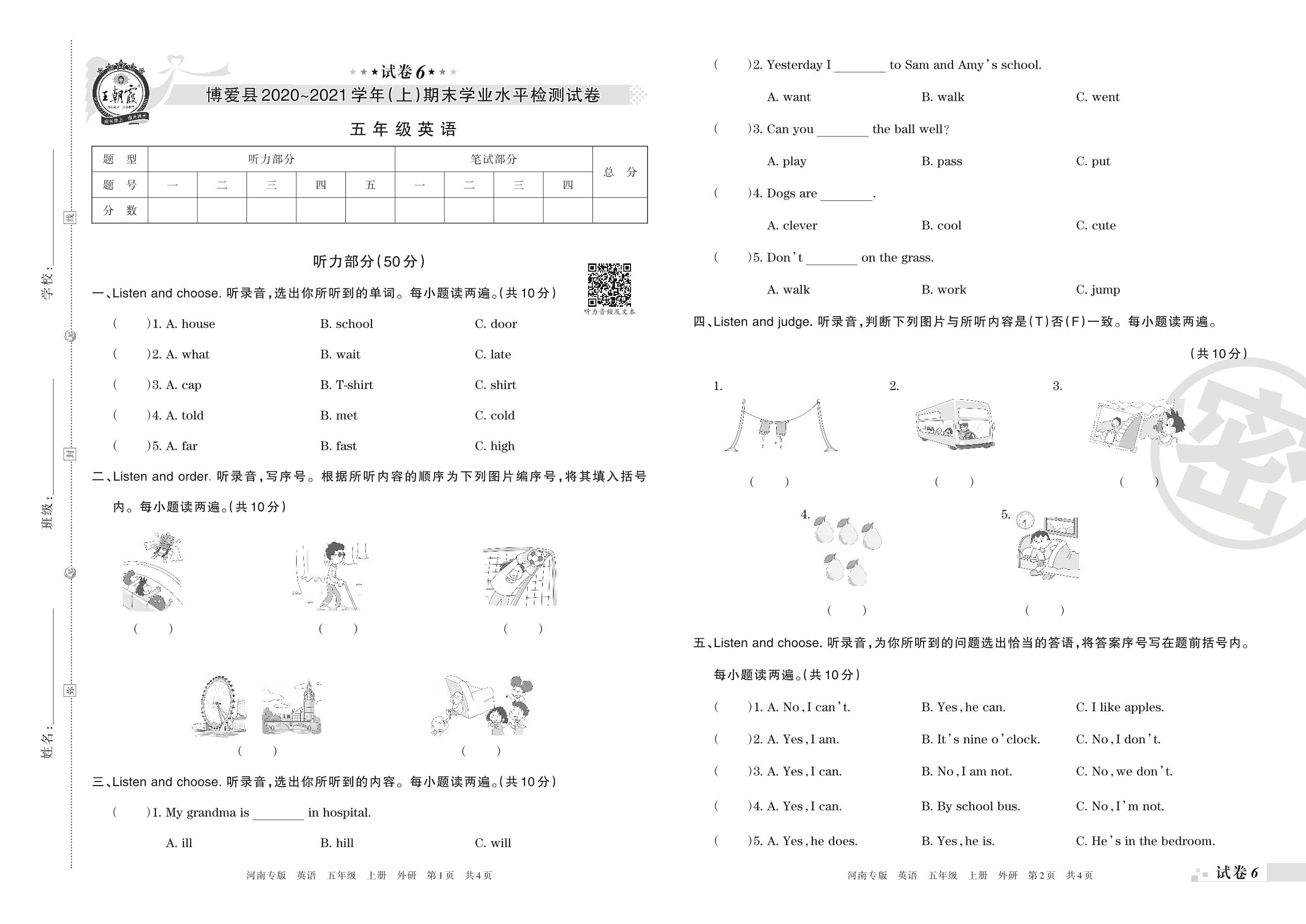 博爱县2020~2021学年(上)期末学业水平检测试卷五年级英语(外研版)【6】