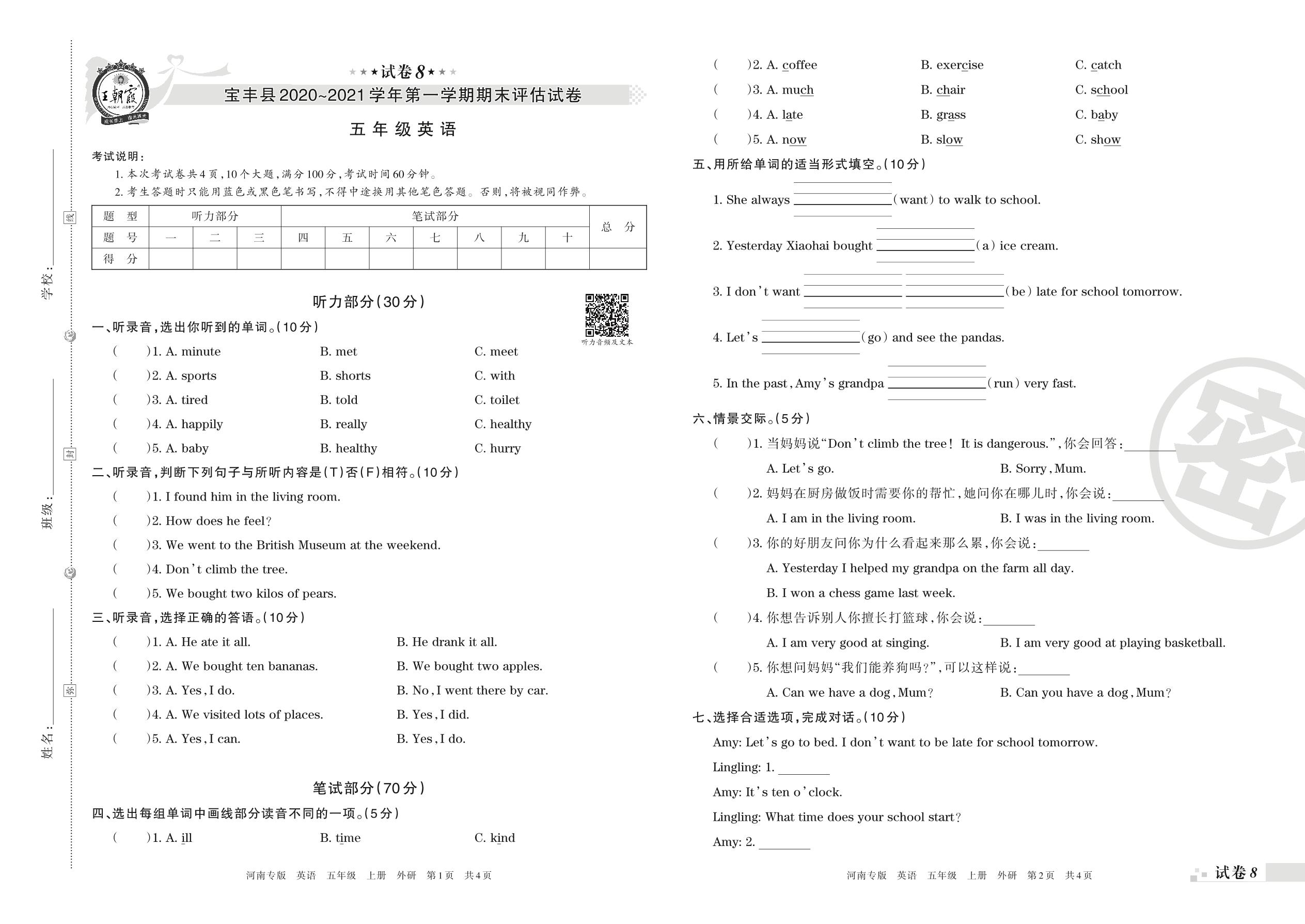 宝丰县2020~2021学年第一学期期末评估试卷五年级英语(外研版)【8】