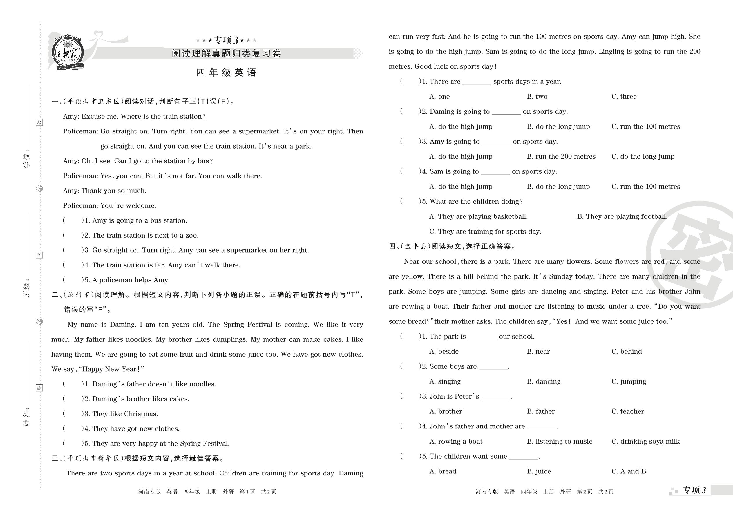 王朝霞期末专项卷——阅读理解真题归类复习卷四年级上册英语(外研版)_R211225150143490【3】