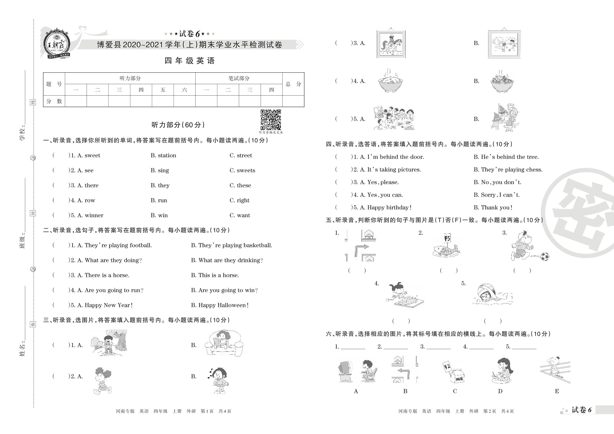 博爱县2020~2021学年(上)期末学业水平检测试卷四年级英语(外研版)【6】